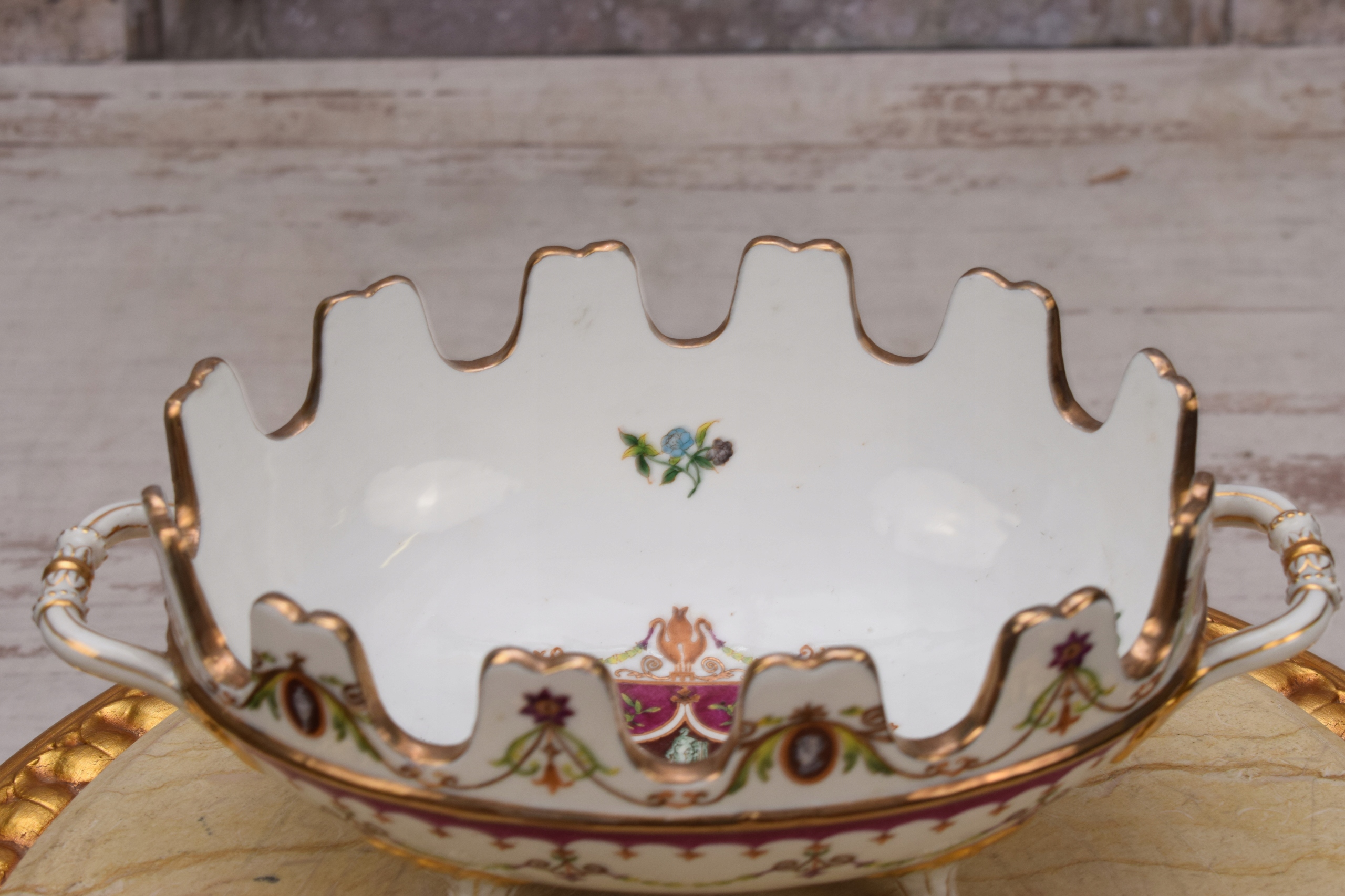 Кошик для тарілок, розписна порцеляна з квітами та перепілками - бронзовий підпис - подарунок