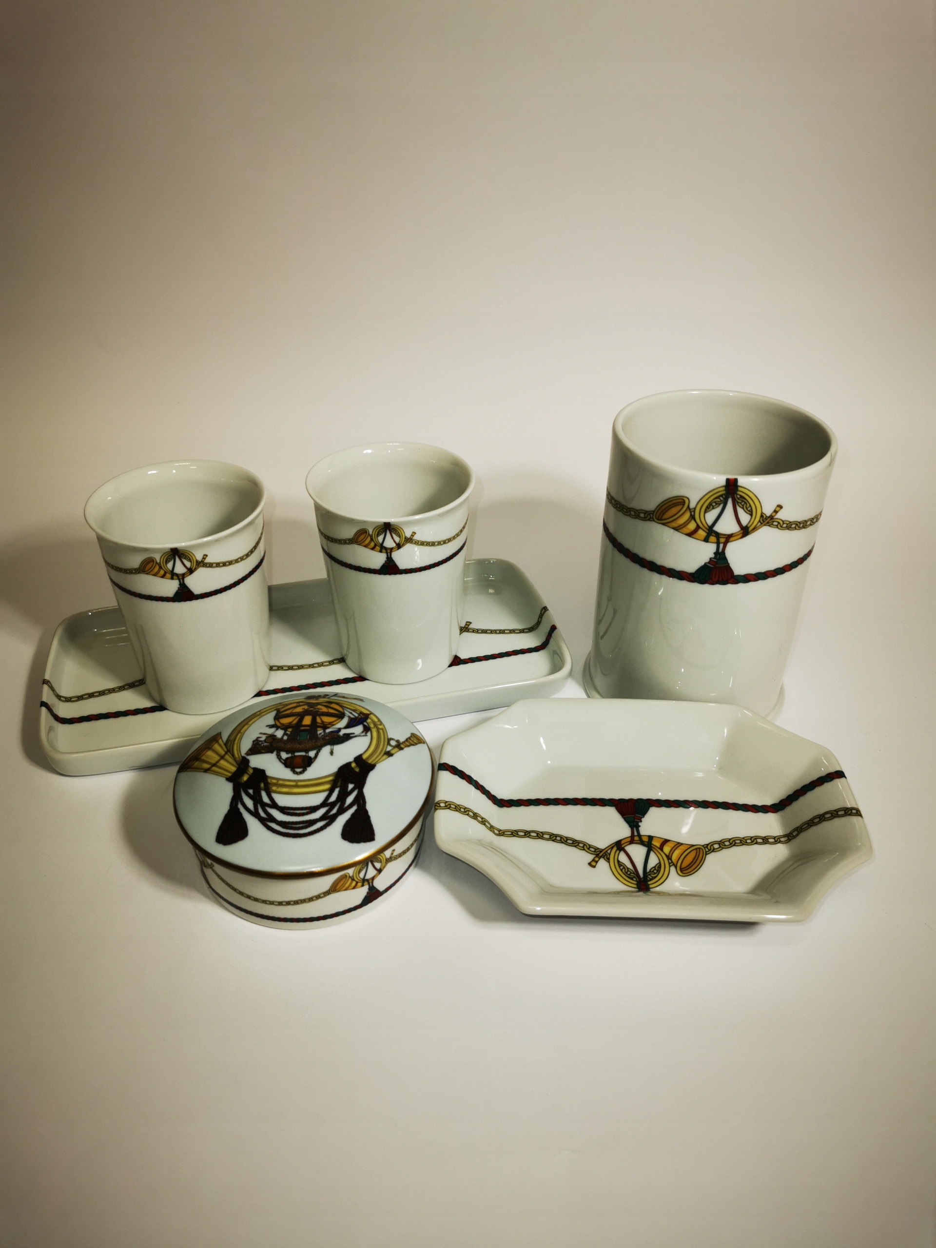 Ми представляємо елегантний набір для ванної кімнати, колись відомий усім королівським дворам Європи. Набір складається з двох менших порцелянових кухлів, однієї більшої кухля, підноса, коробки та мильниці. Усі речі належать до колекції La Posta. Кожен елемент підписаний логотипом бренду та назвою колекції.
