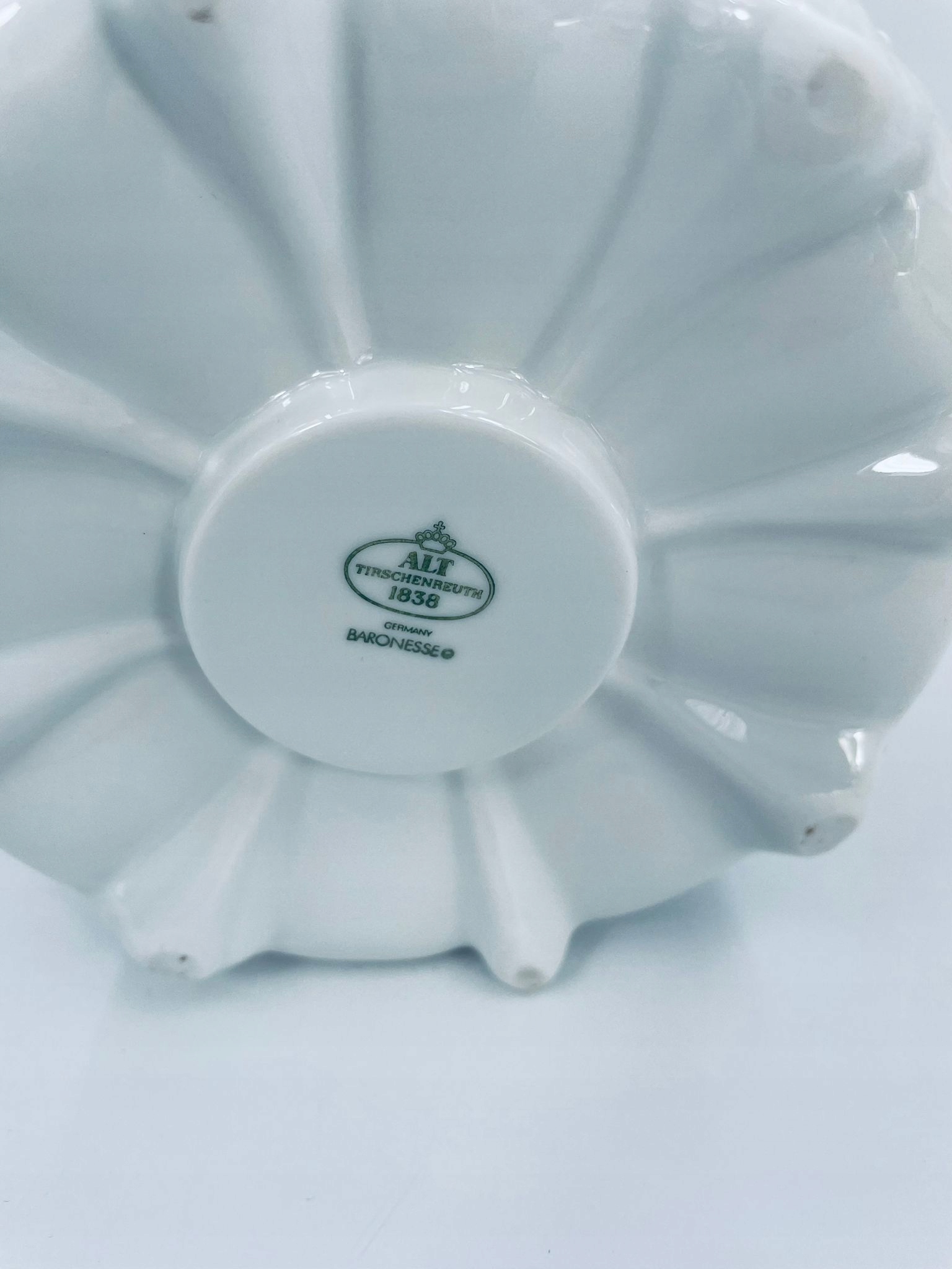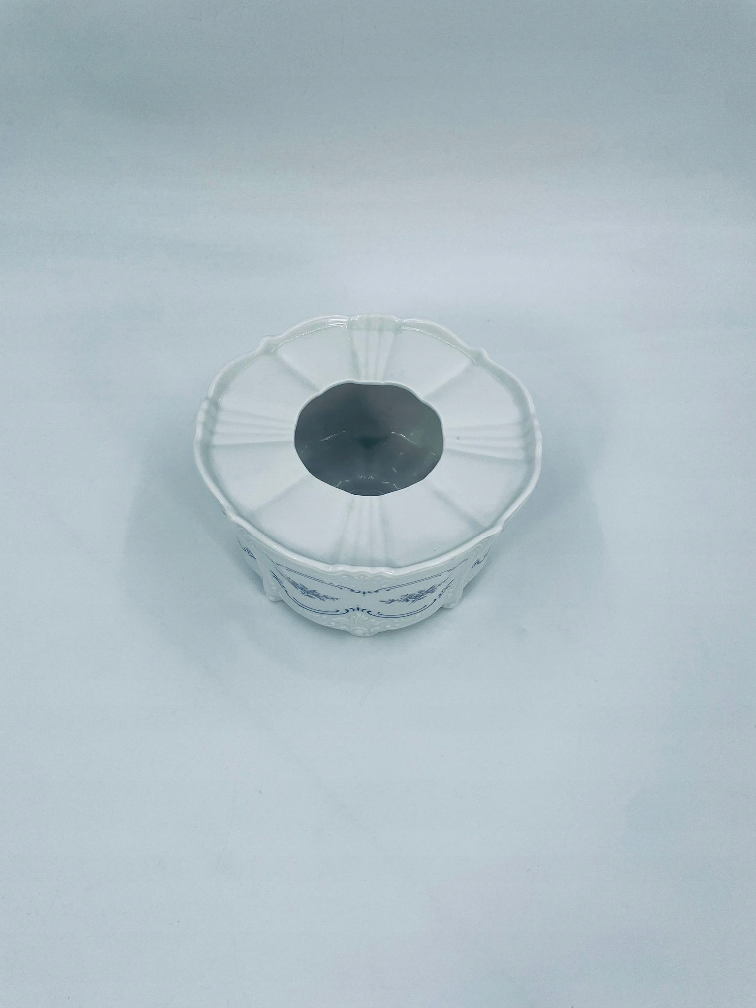 Порцелянова грілка Tirschenreuth виготовлена з високоякісної білої порцеляни. Утеплювач із візерунком Fleur De Lis Blue, що характеризується синіми акцентами, квітковим малюнком, декоративними рельєфами та хвилястим краєм. Нагрівач використовується для підтримки тепла напоїв і їжі, розміщуючи під ним невелику свічку.
