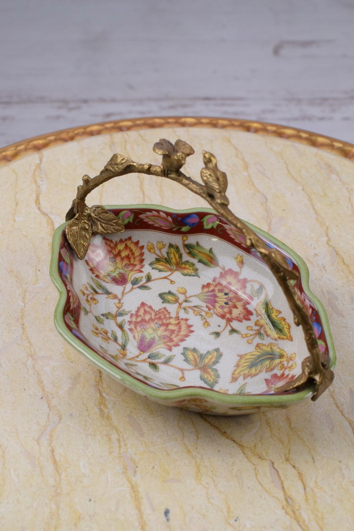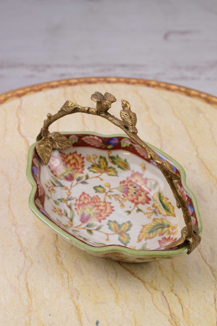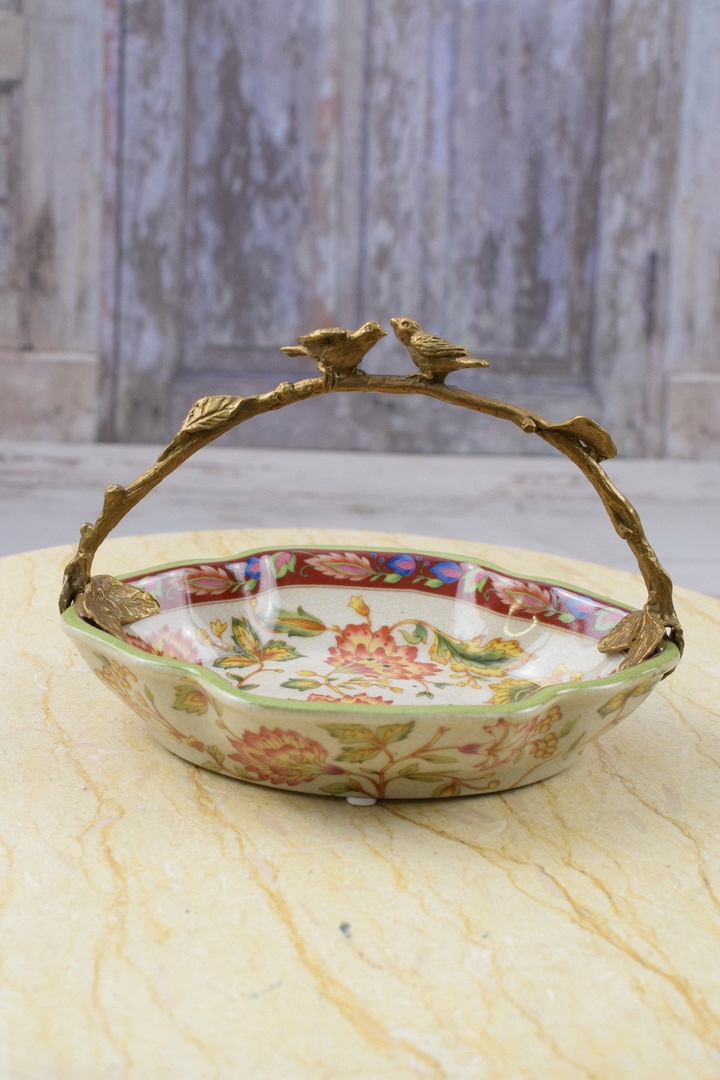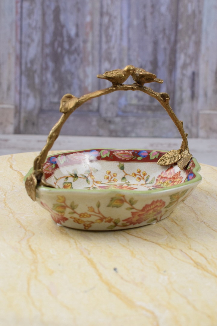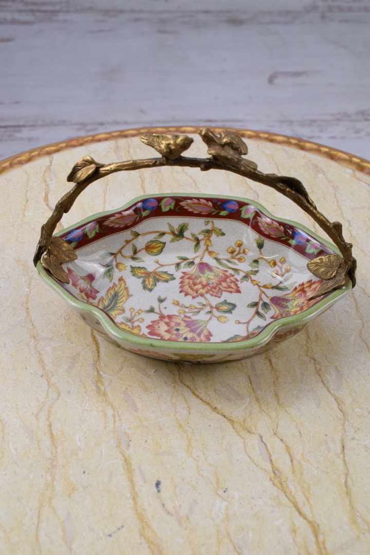 Порцеляновий різнобарвний блюдний кошик - бронзова фігура птахів