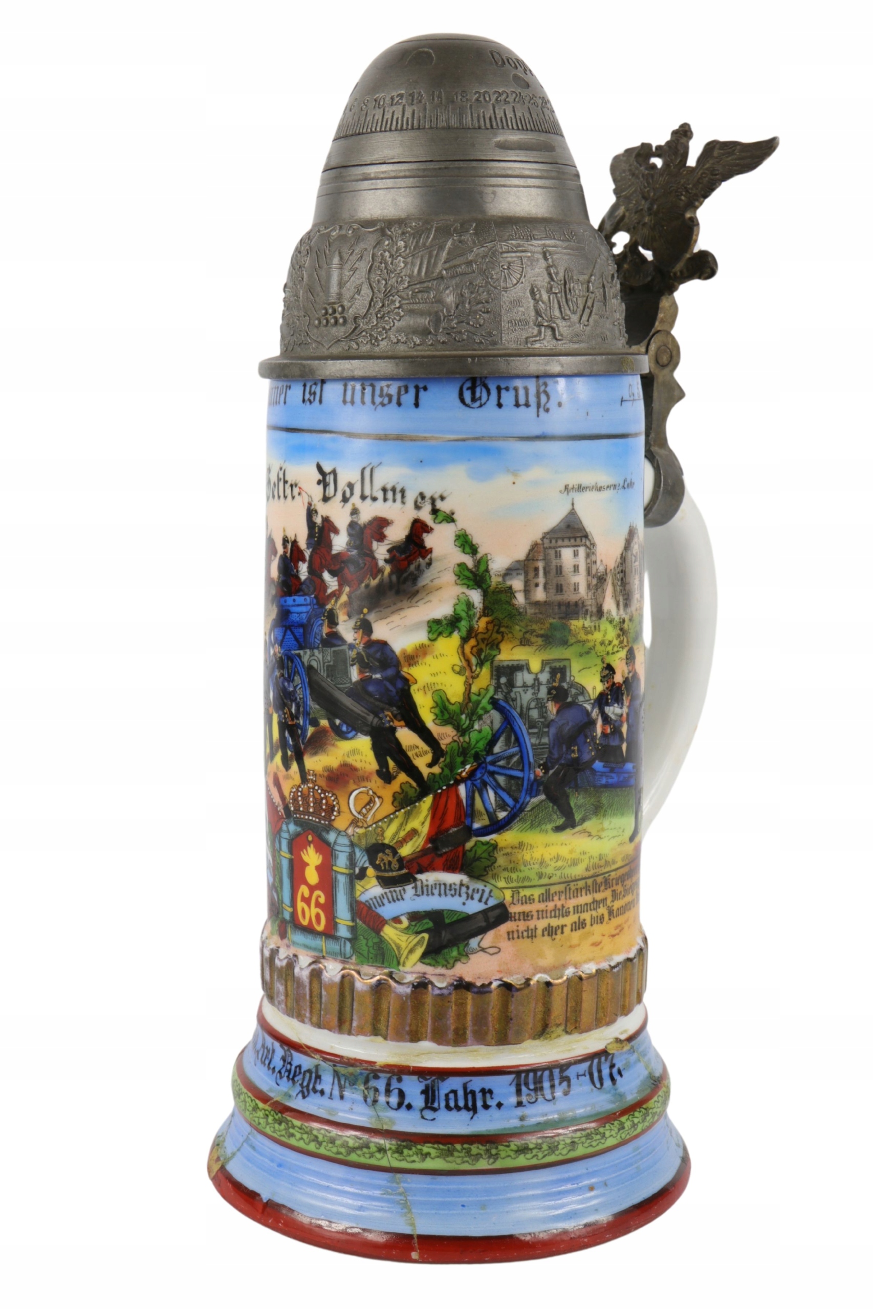 рука -пофарбована кухоль резуарного резервуару. Порцеляновий орнамент з розфарбованим рукою. З фронту, артилерійська команда з розділом у списку назв, на сторонах малюнків казарми та місто армії. Артилерійська оболонка, укладена кружкою, кришка цинку, стилізована в запалювачі допп з 96 та полегшенням багатокутних сцен. Нижня кухоль зі сценою картини у вигляді літофану (малюнок з’являється після підсвічування) дуже цікавий об’єкт рідкісного колекціонера.