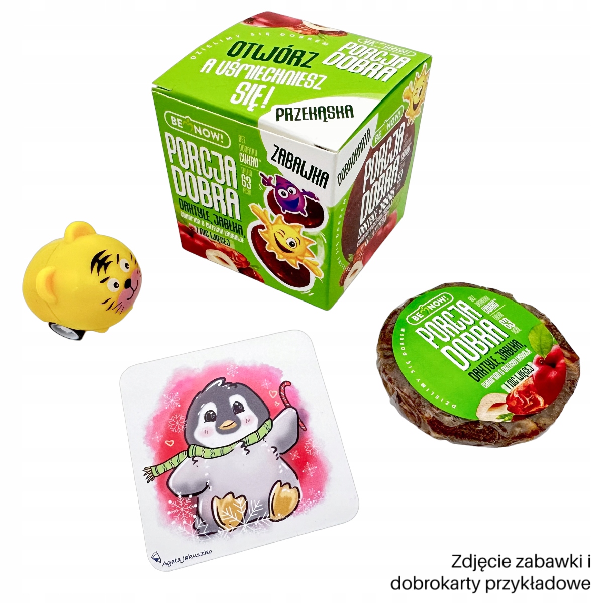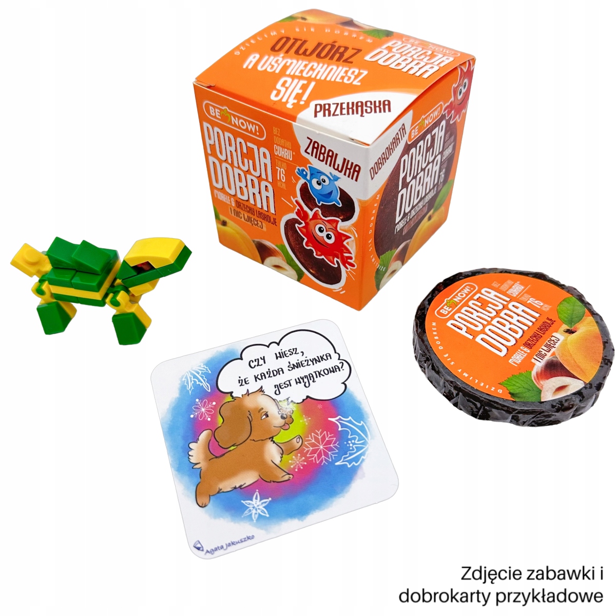 Дитяча коробка Porcja Dobra містить, серед іншого, 6 кубиків-сюрпризів з різними смаками. Іграшки-сюрпризи не дадуть вашому малюку нудьгувати, пробуючи смачні та корисні ласощі. Крім того, завдяки набору дитина отримає міні-колекцію гарних листівок, які вчать вдячності та добра.