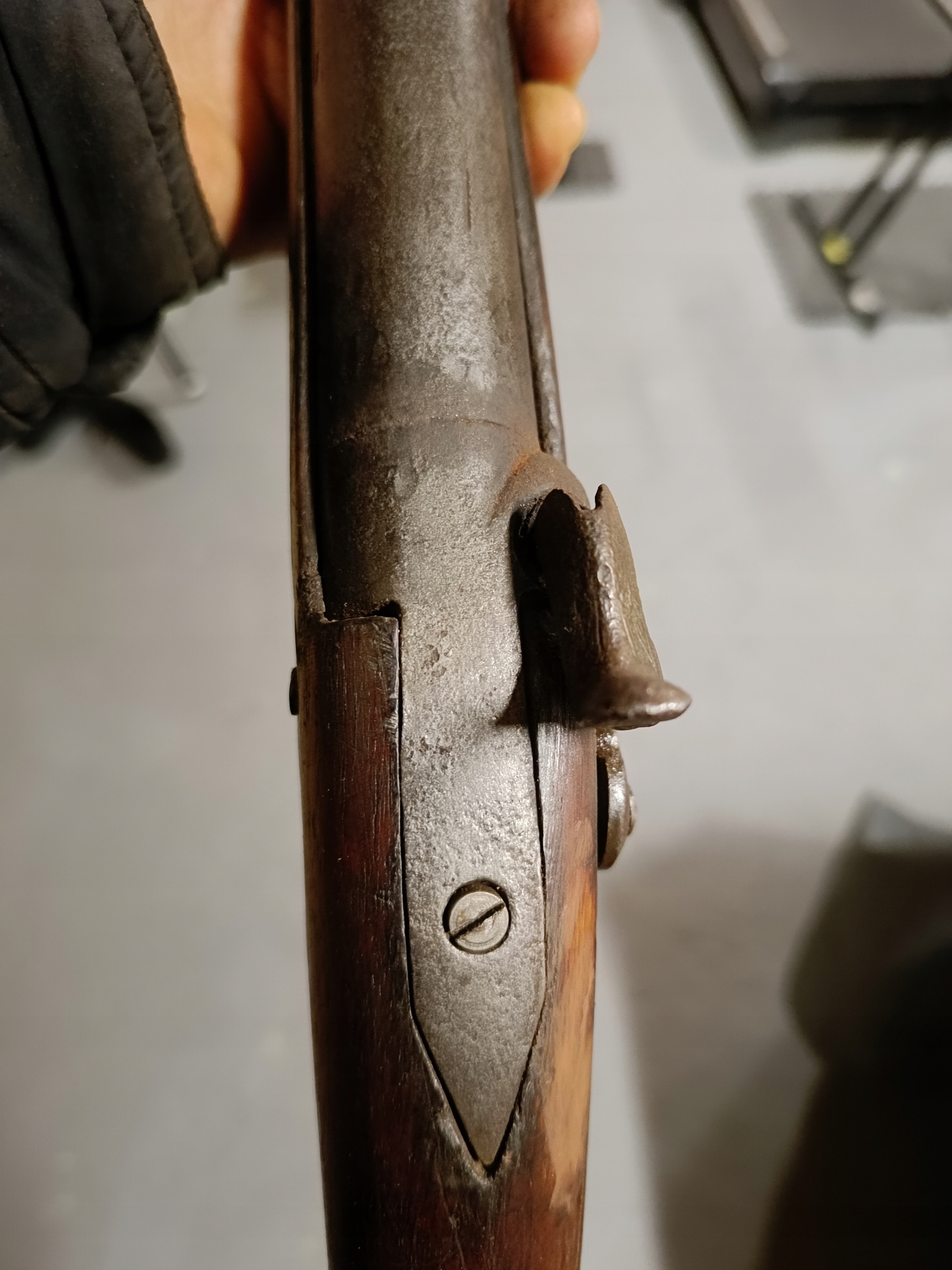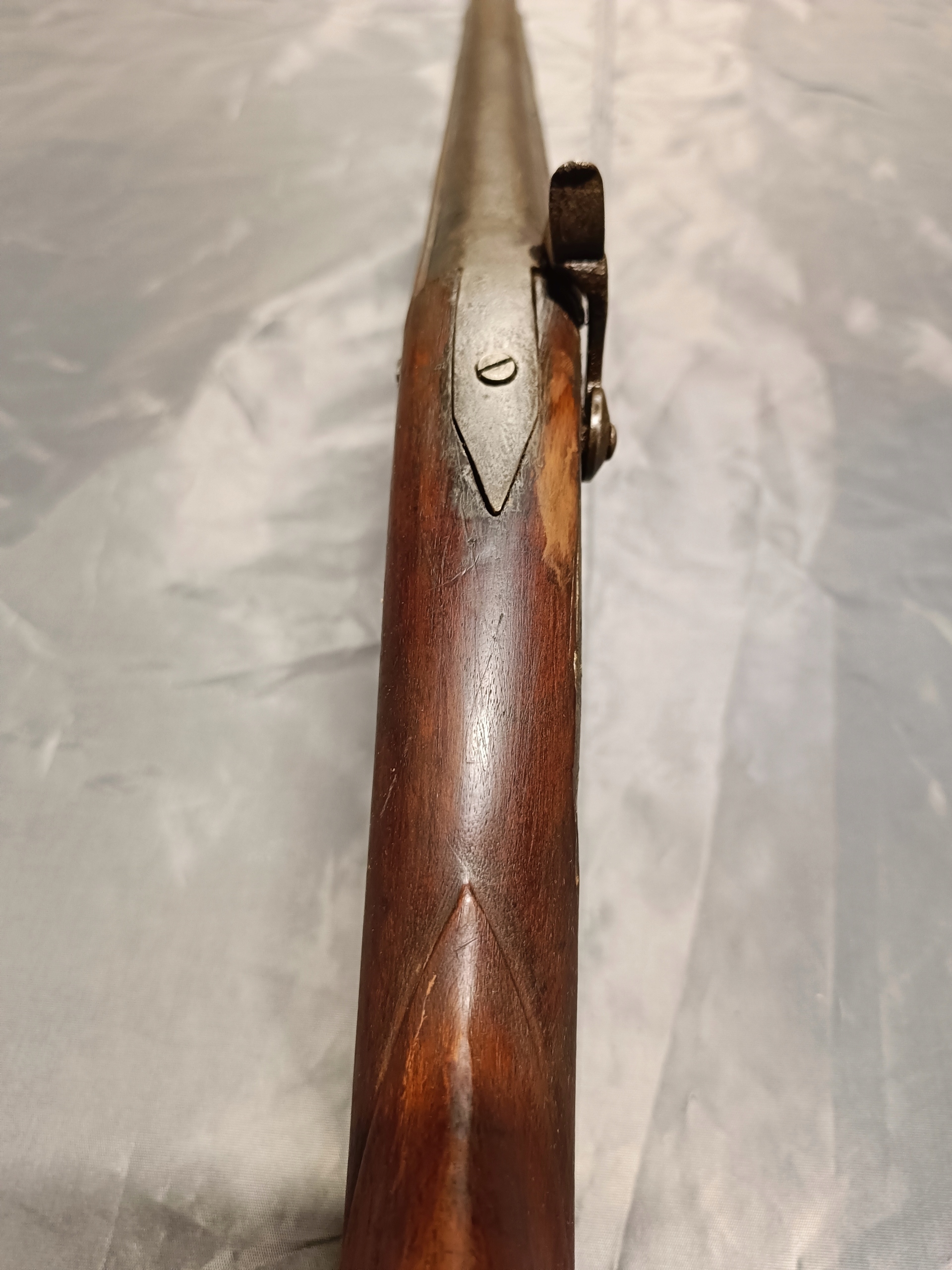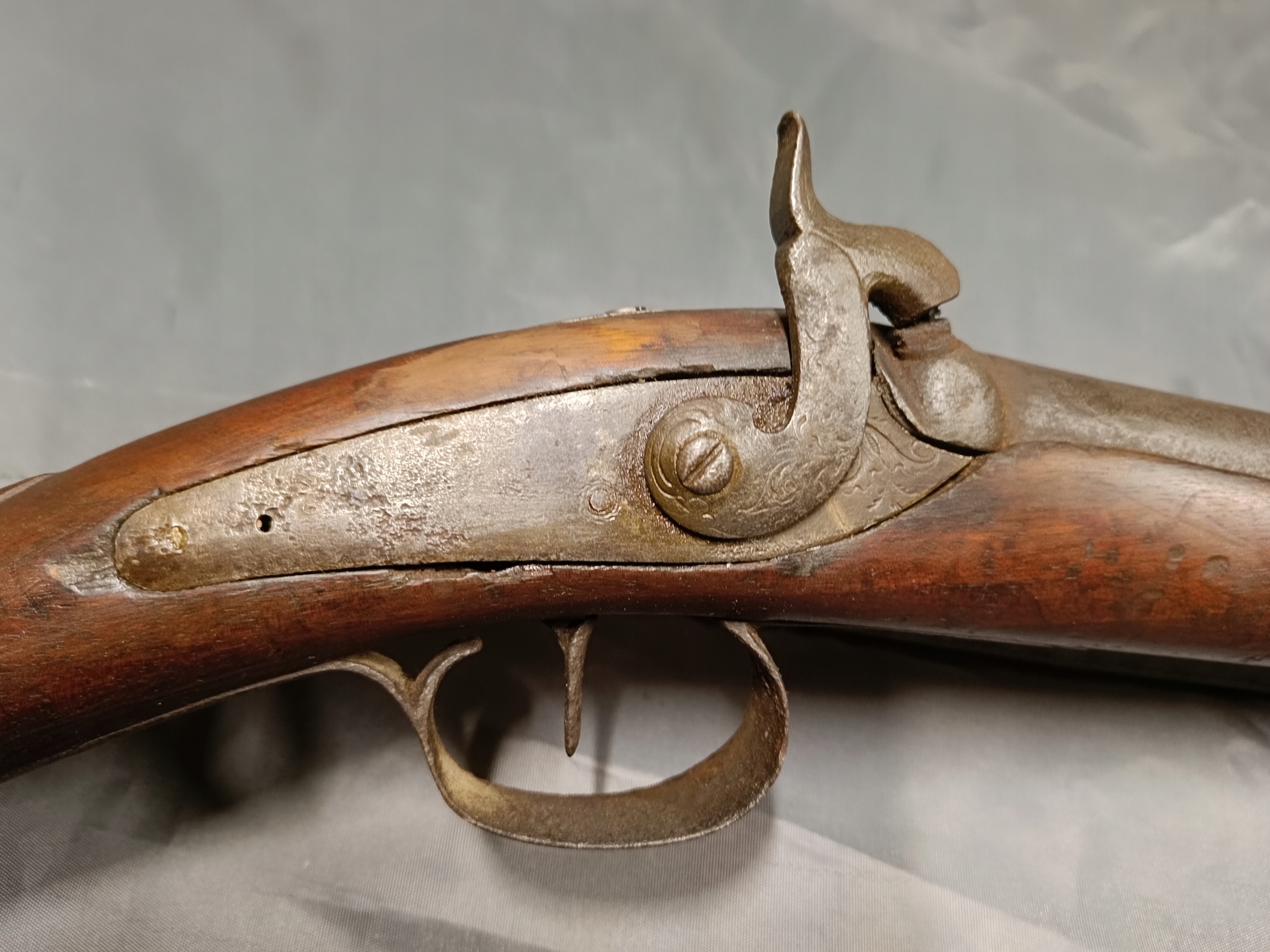 Фронтальне заряджання. Можна зробити сухий постріл, подвійну нічию. Замок курка затягується з двох причин. Пружина натягу не дуже сильна, але я перевірив кришку, вона зламається. Стовбур має мінімальну виїмку. Півень має невеликий люфт. Дерево в відносно хорошому стані. Камін потрібно замінити – він не заблокований.