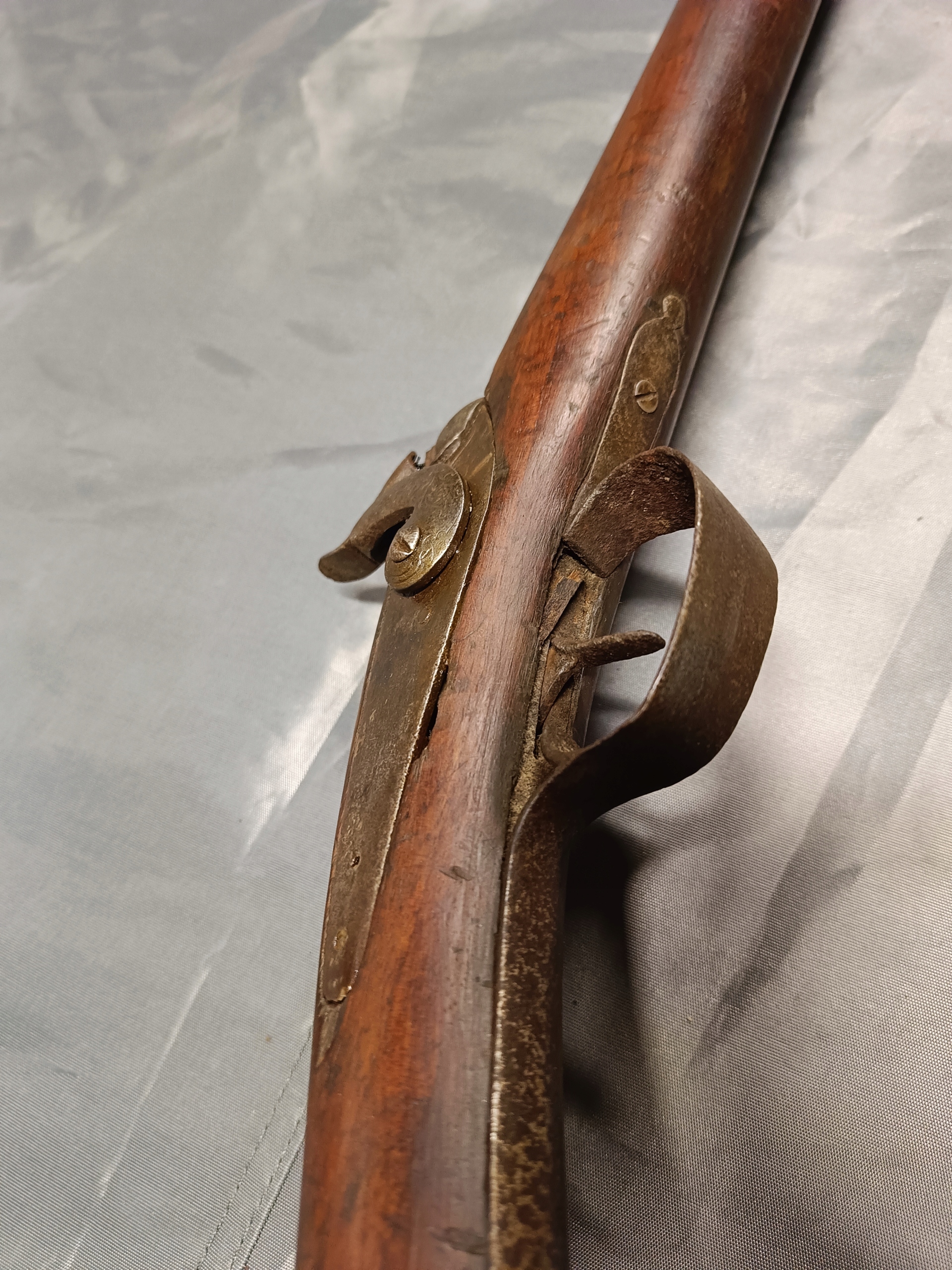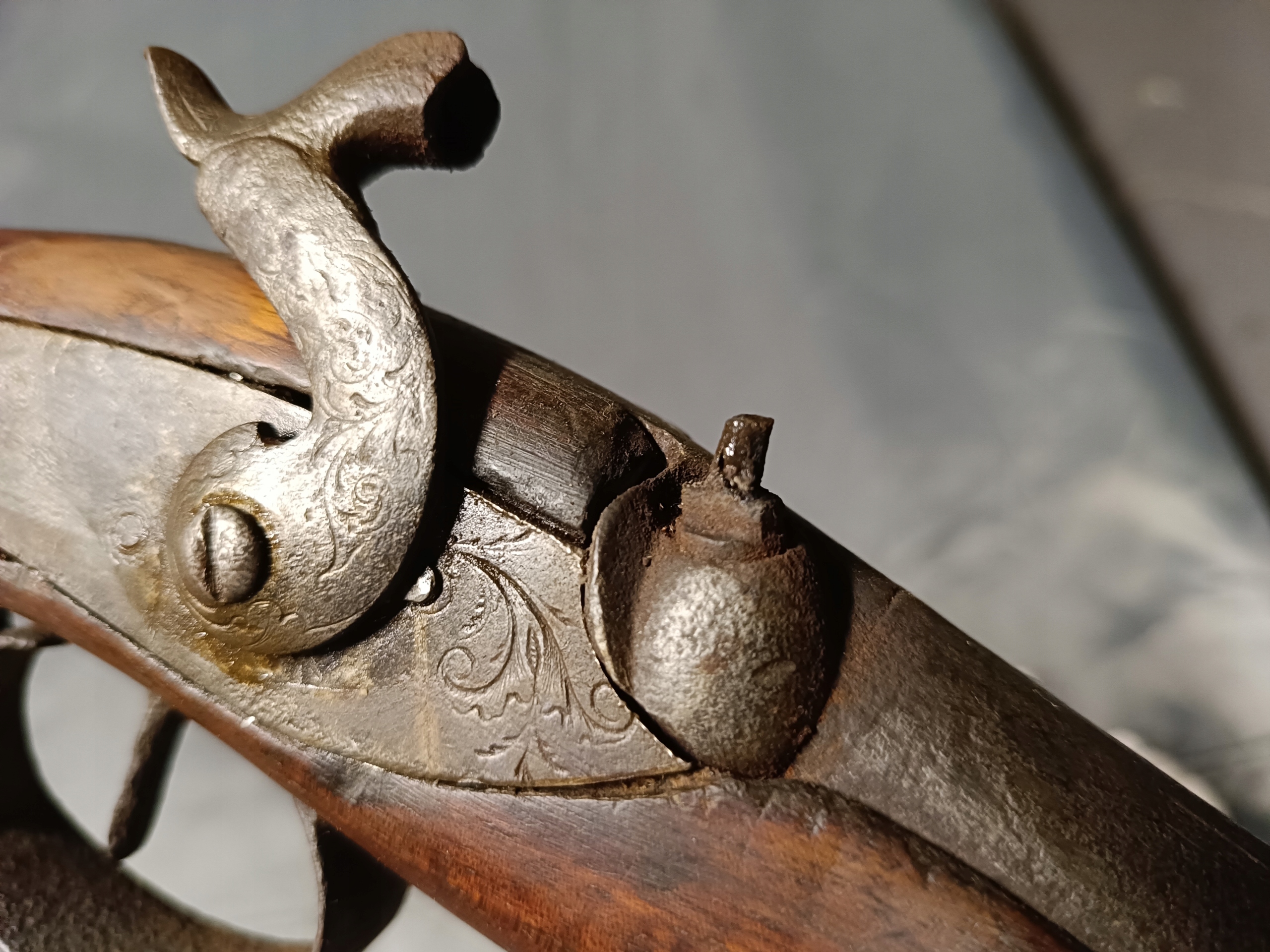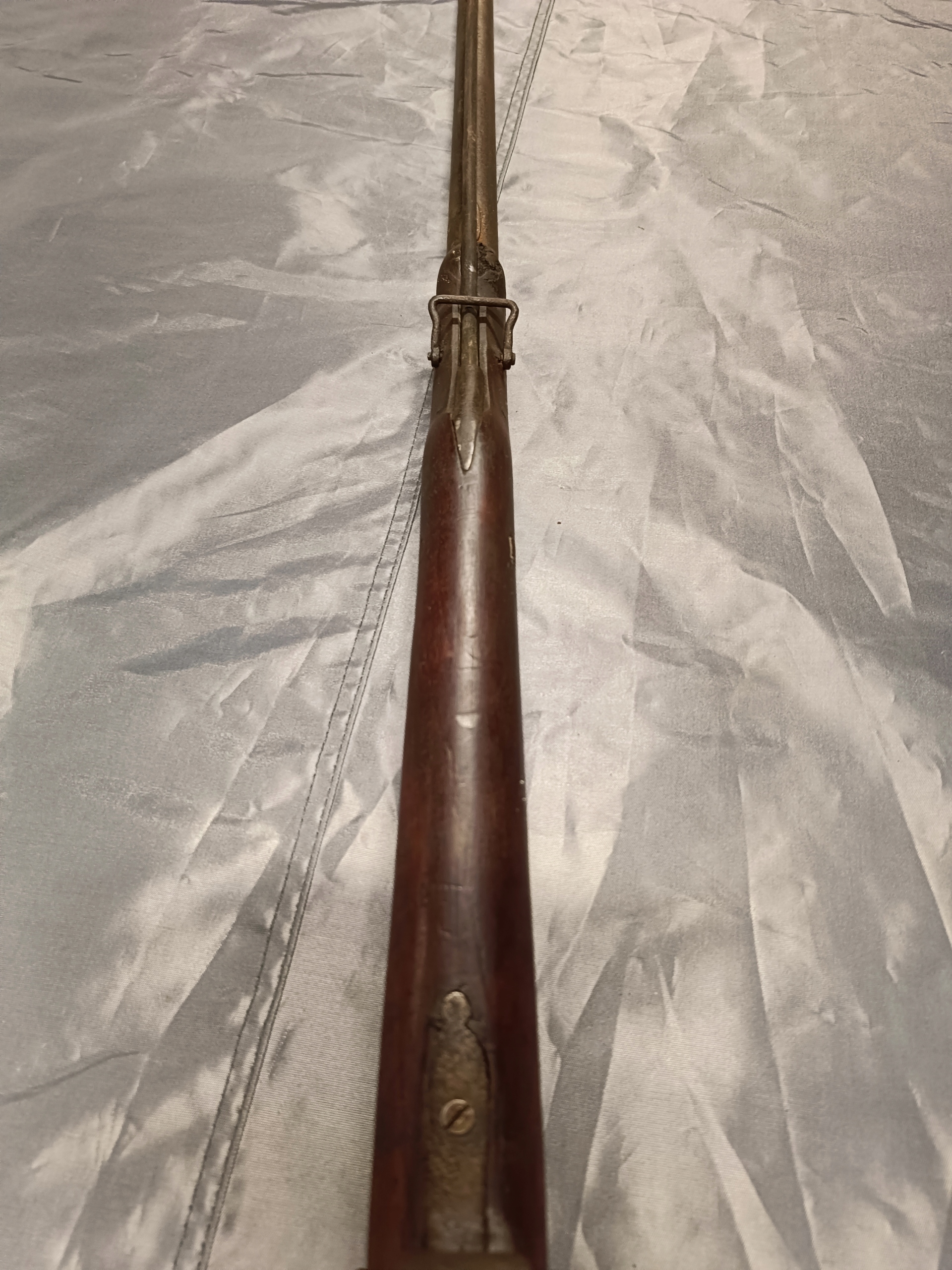 Фронтальне заряджання. Можна зробити сухий постріл, подвійну нічию. Замок курка затягується з двох причин. Пружина натягу не дуже сильна, але я перевірив кришку, вона зламається. Стовбур має мінімальну виїмку. Півень має невеликий люфт. Дерево в відносно хорошому стані. Камін потрібно замінити – він не заблокований.