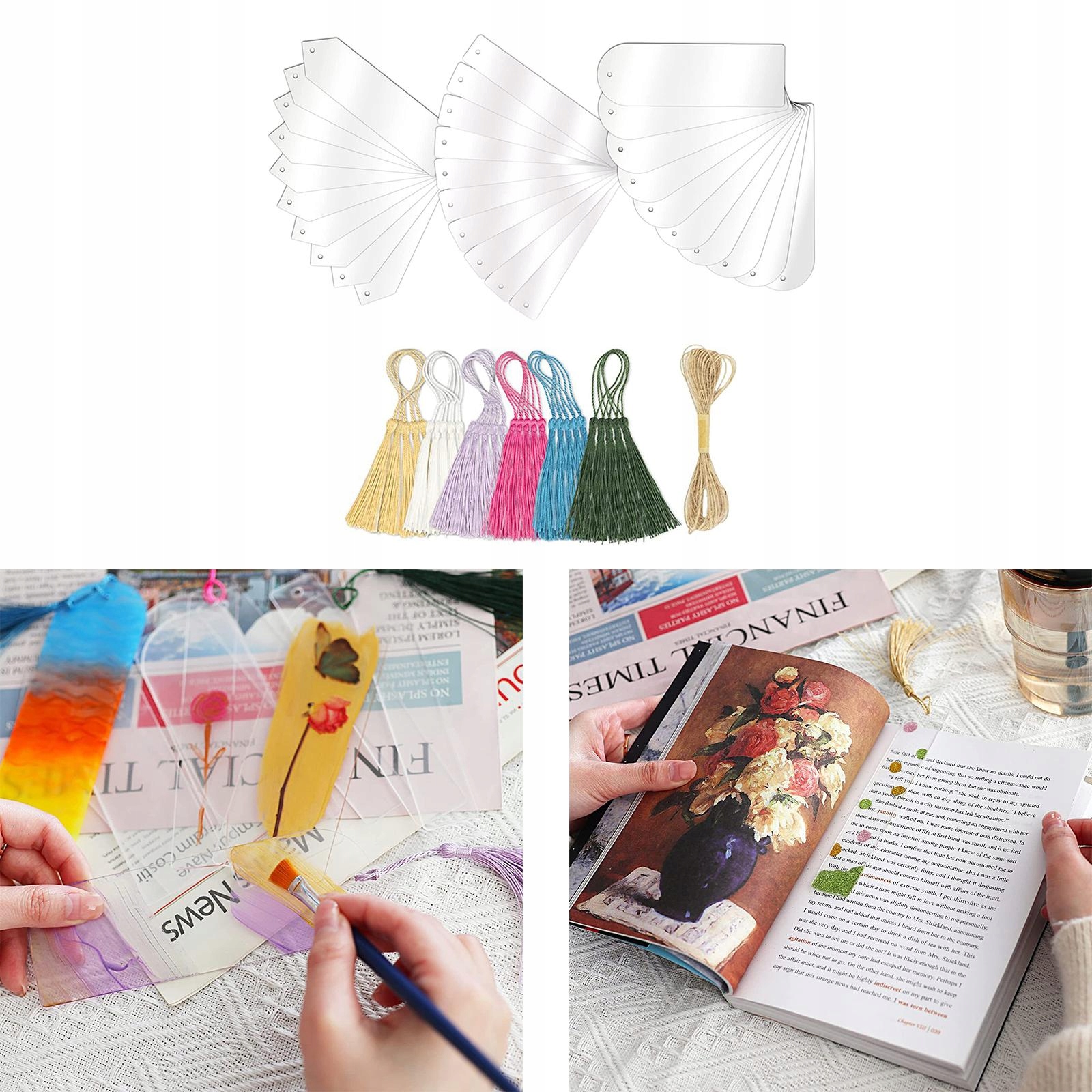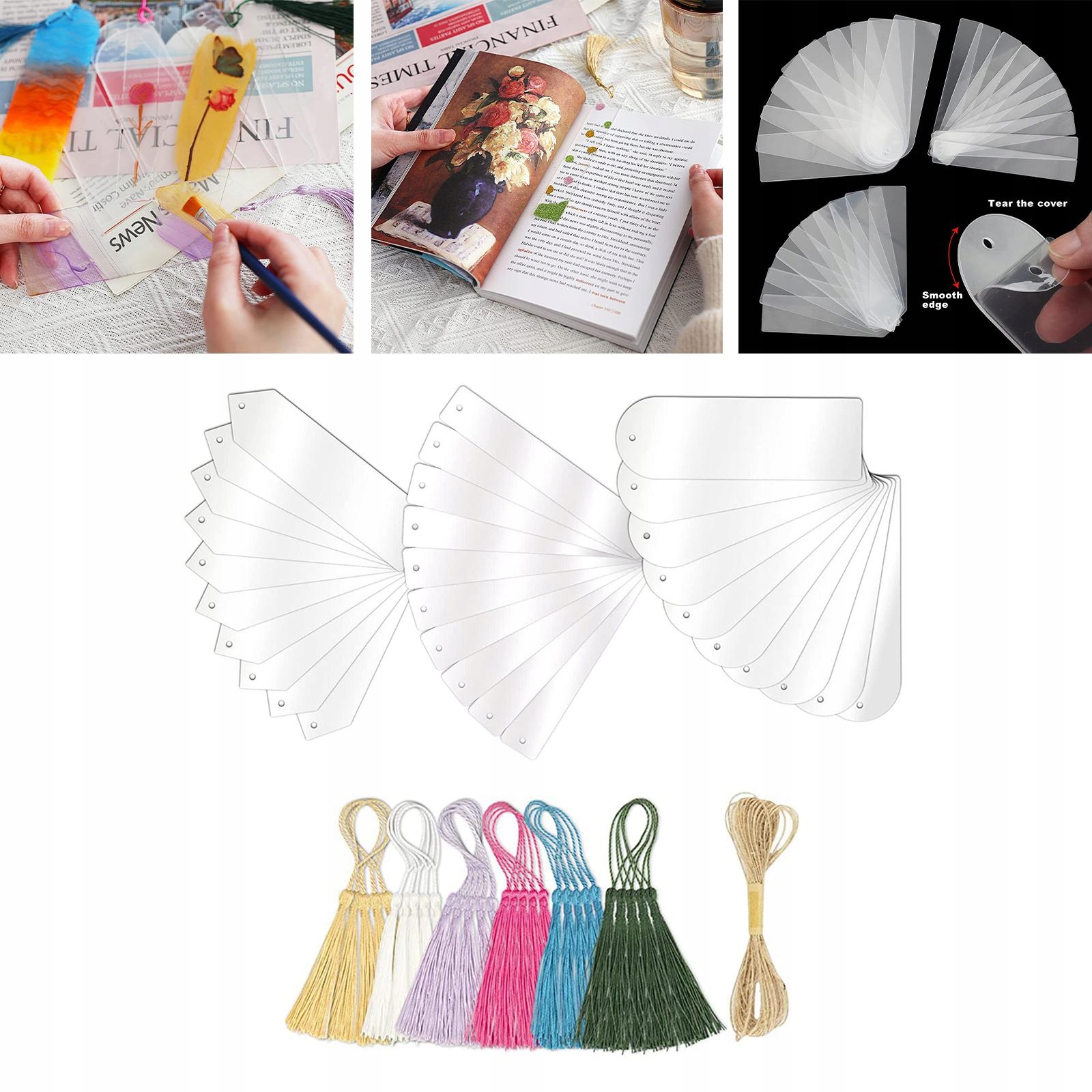 Упаковка: Ви отримаєте загалом 30 акрилових шматочків порожніх закладок і 30 кольорових бахроме в 6 різних кольорах та 1 шматок тонкої мотузки.