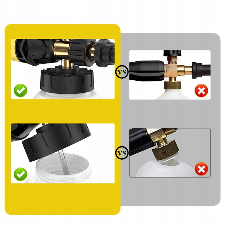 - Виготовлений із міцної латуні та високоякісного пластику, запобігає корозії та забезпечує герметичність, не потрібно турбуватися про витік; 2. Посилена широка горловина запобігає появі тріщин і легко заповнюється мильною водою. 3. Легка заміна сопла з отвором - просто відкрутіть внутрішню різьбу M22 на чорному адаптері karcher, ви можете перевірити стан і замінити його