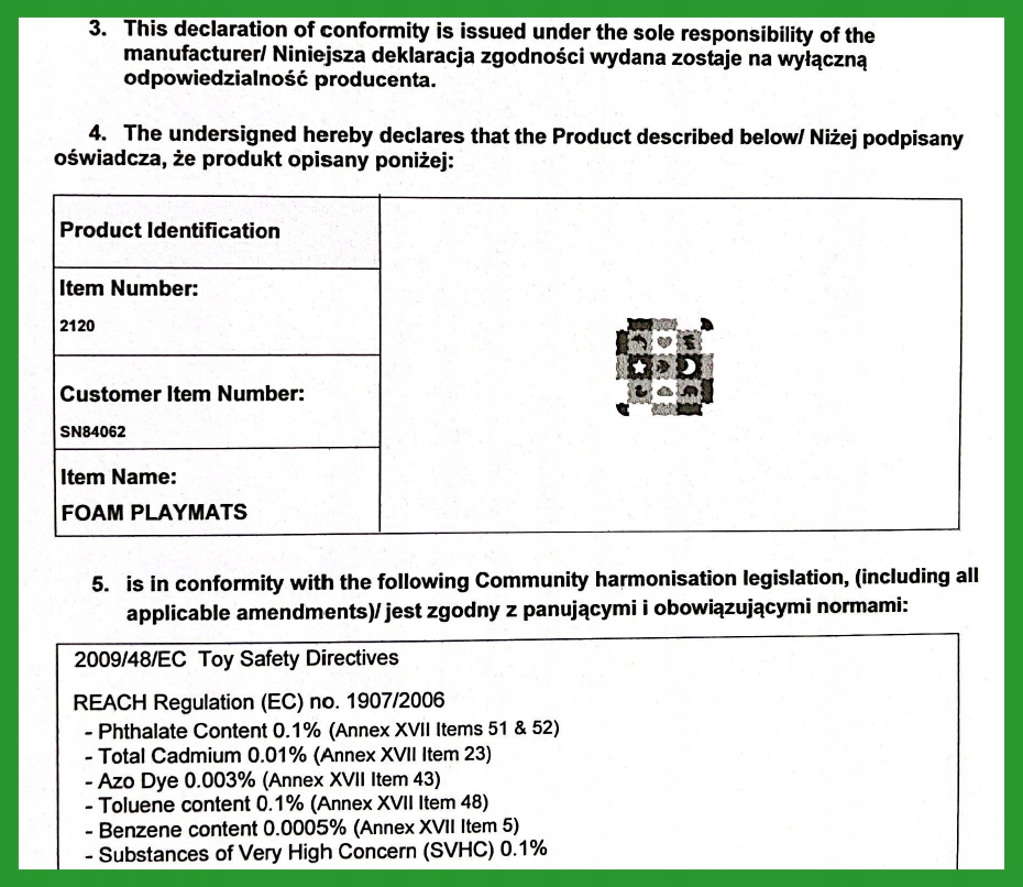 Кожна наша продукція сертифікована, має необхідні сертифікати та не має негативного впливу на здоров’я та безпеку. Кожен килимок нетоксичний, не містить формамід і фталати, ПВХ або Бісфенол А.
