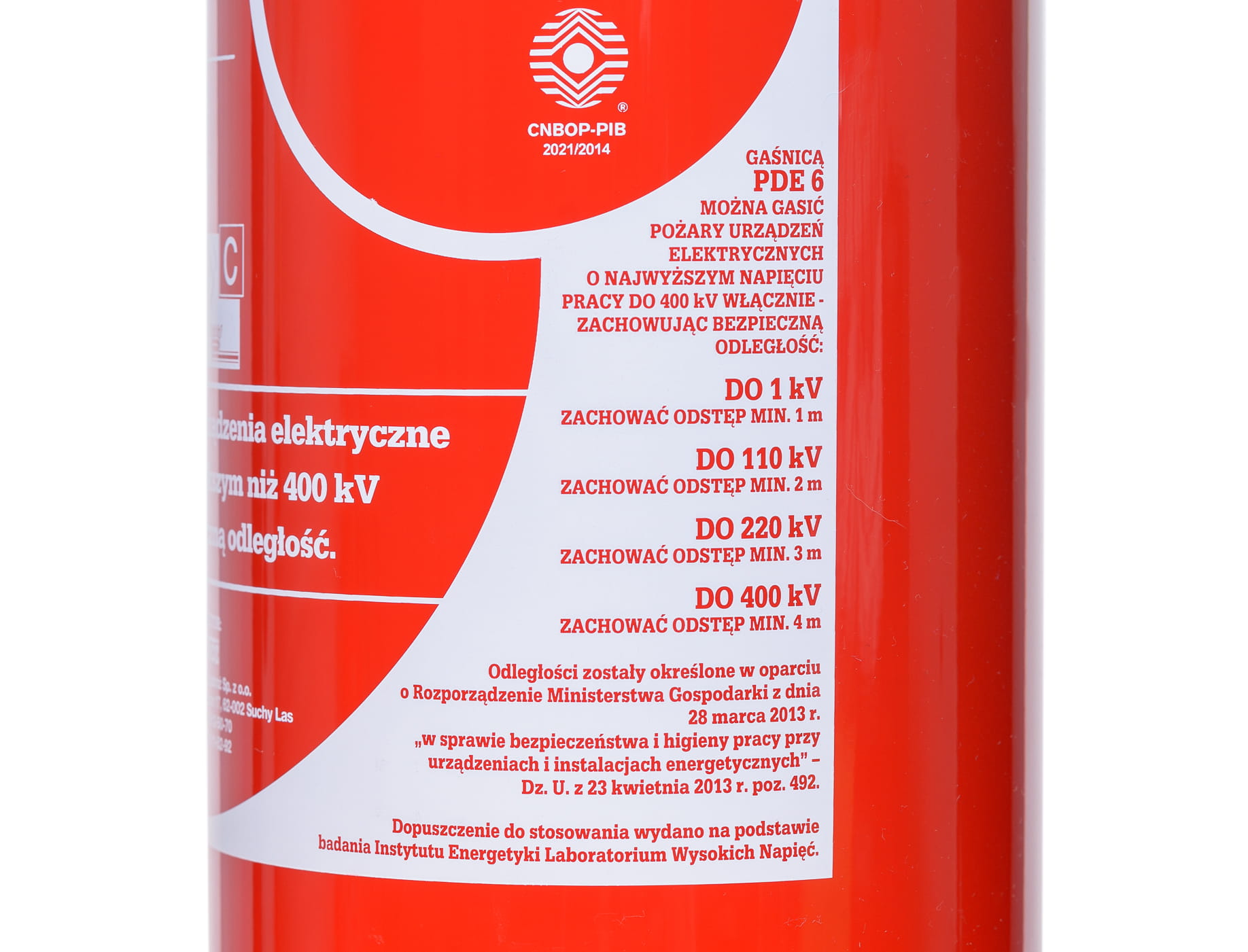PDE 6 вогнегасник має дуже високу ефективність пожежі 34a 183b. Ви можете викласти пристрої під напругою до 400 кВ.