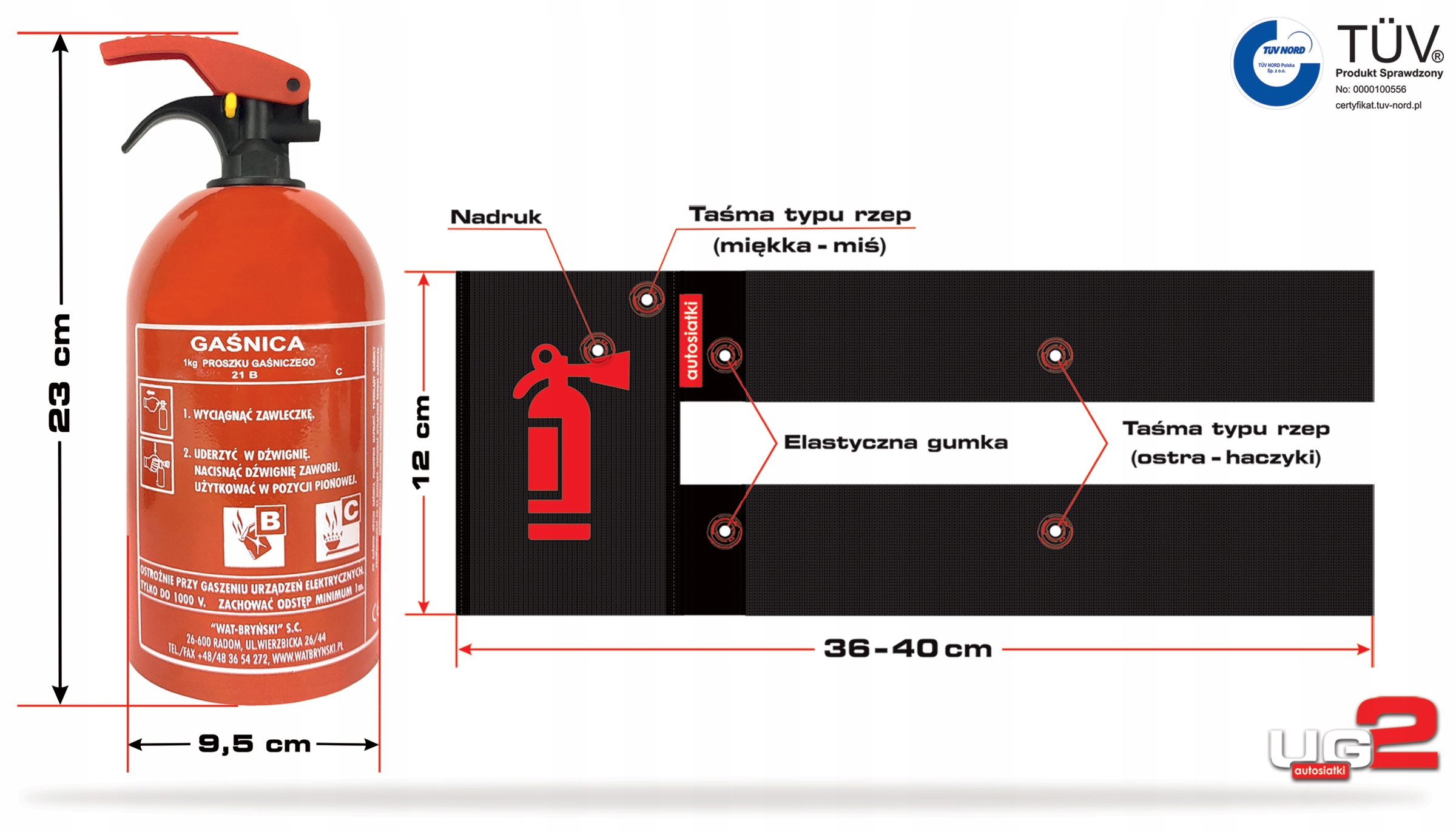 Перед покупкою переконайтеся, що липучка прилипає до оббивки вашого багажника. Якщо липучка, наприклад, від куртки чи сумки, прилипне до килима, стрічка вогнегасника поводитиметься так само.