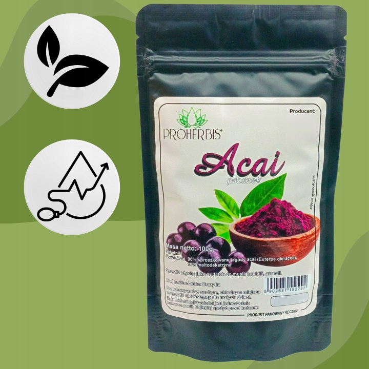порошок Acai має трохи кислий фруктовий смак, ідеально підходить для поєднання з іншими інгредієнтами, такими як йогурт, мюслі або коктейлі.