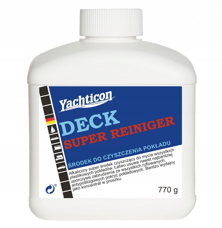Yachticon Deck Super Reiniger - лужний засіб для чищення ламінованих палуб. Легко видаляє навіть найстійкіші забруднення. Він ідеально працює на всіх типах поверхонь, рифлених, гладких і нековзких. Безпечний для гелькоута. Зберігаю протиковзкі властивості. Вони також працюють у солоній морській воді.