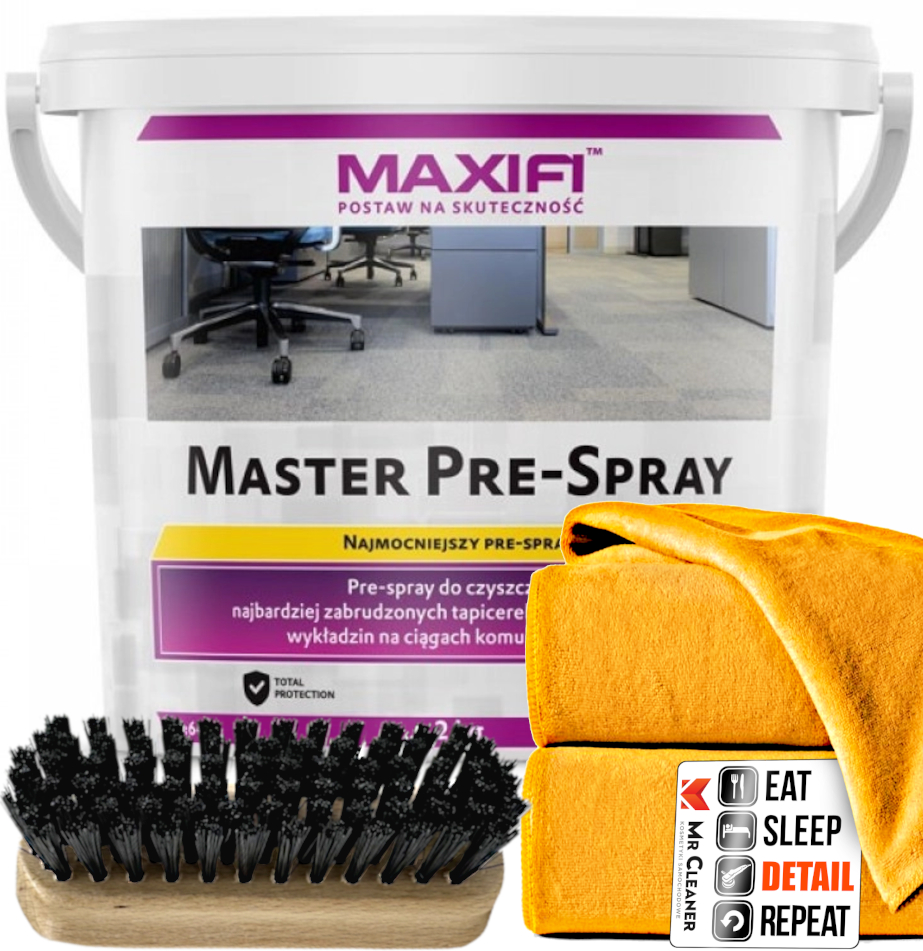 Master Pre-Spray створено для чищення сильно забруднених килимів та оббивки автомобілів. Швидкодіючі поверхнево-активні речовини миттєво проникають і відокремлюють бруд від волокна, розчиняючи його та створюючи суспензію, яку легко змити. Щоб підвищити ефективність видалення жирних забруднень, засіб збагачено натуральним розчинником CITRUS POWER.