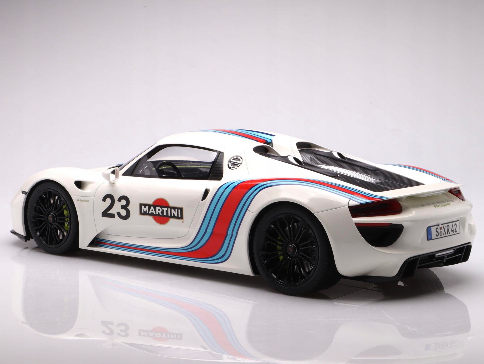 Porsche 918 Spyder "MARTINI" - ідеально відтворена модель автомобіля, який є справжнім шедевром техніки та розкоші. Ця вражаюча копія в масштабі 1:12, створена GT Spirit, дивує своїм неперевершеним рівнем деталізації та точності. Починаючи зовні, ця модель виглядає надзвичайно вражаюче, з достовірно відтвореним кузовом і характерними деталями, такими як аеродинамічні форми, стильні бічні дзеркала та характерний логотип «MARTINI», який надає їй спортивного характеру. Точність форм і пропорцій робить візуальне враження майже ідентичним справжньому Porsche 918 Spyder.