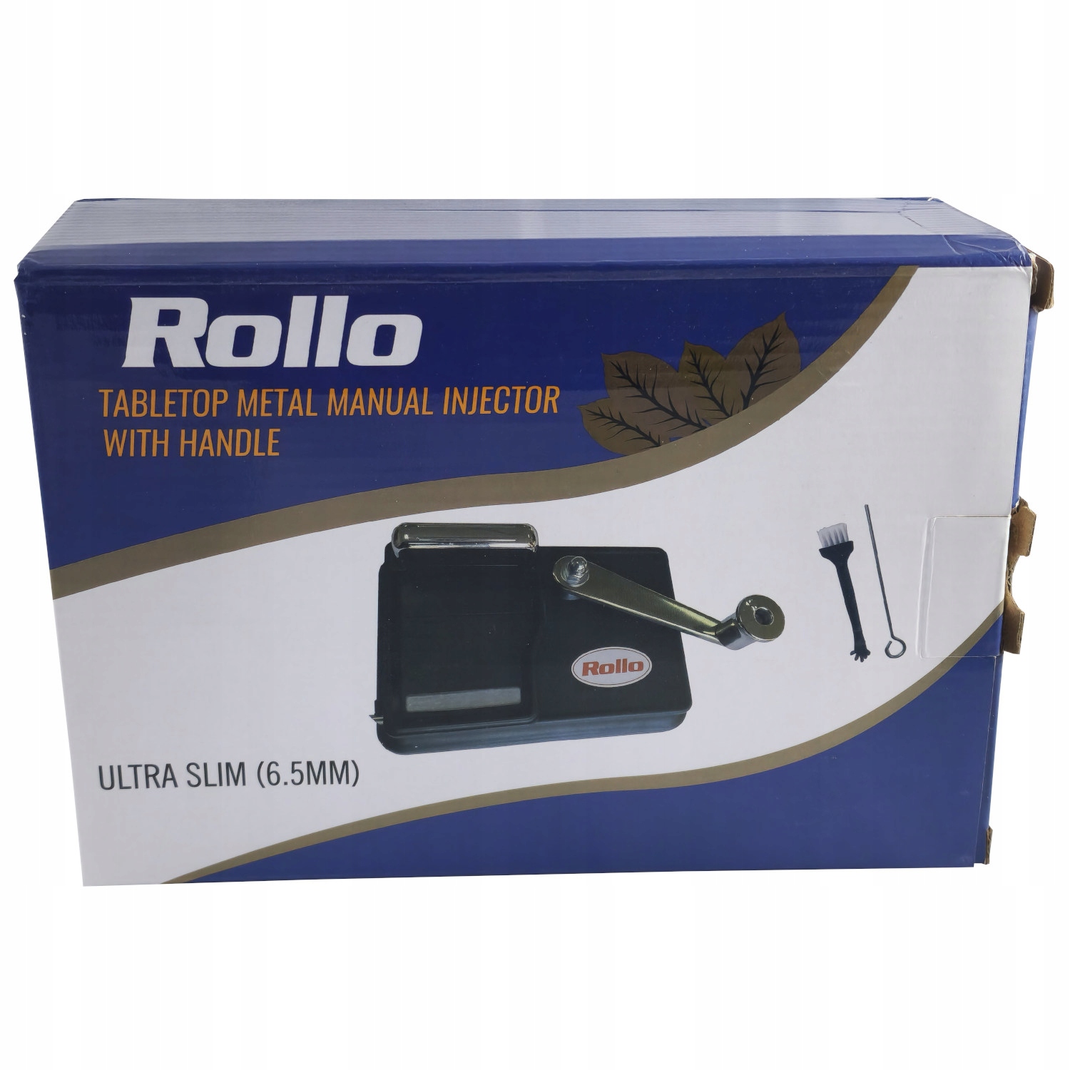 Поршнева машина для вставлення тубусів Rollo Ultra Slim 6,5 мм, напівавтоматична з важелем і ручкою. Корпус машини зроблений з металу, нижня частина вкладиша Rollo Ultra Slim 6,5 мм виготовлена з пластику, який можна відкрутити двома гвинтами збоку машини, після чого можна очистити внутрішню частину машини.