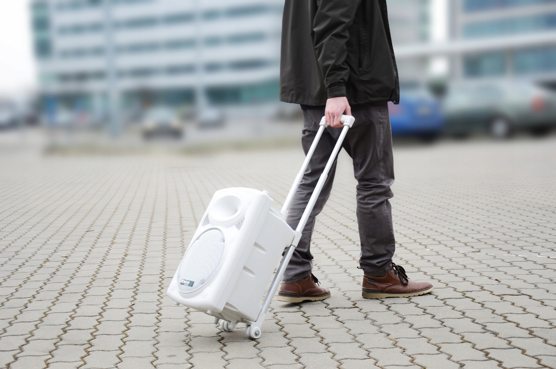 це набір мобільних колонок із двома мікрофонами. Всі вони оснащені коліщатками і телескопічними ручками, завдяки чому колонки легко транспортувати і з ними можна пересуватися, як валізу на колесах.