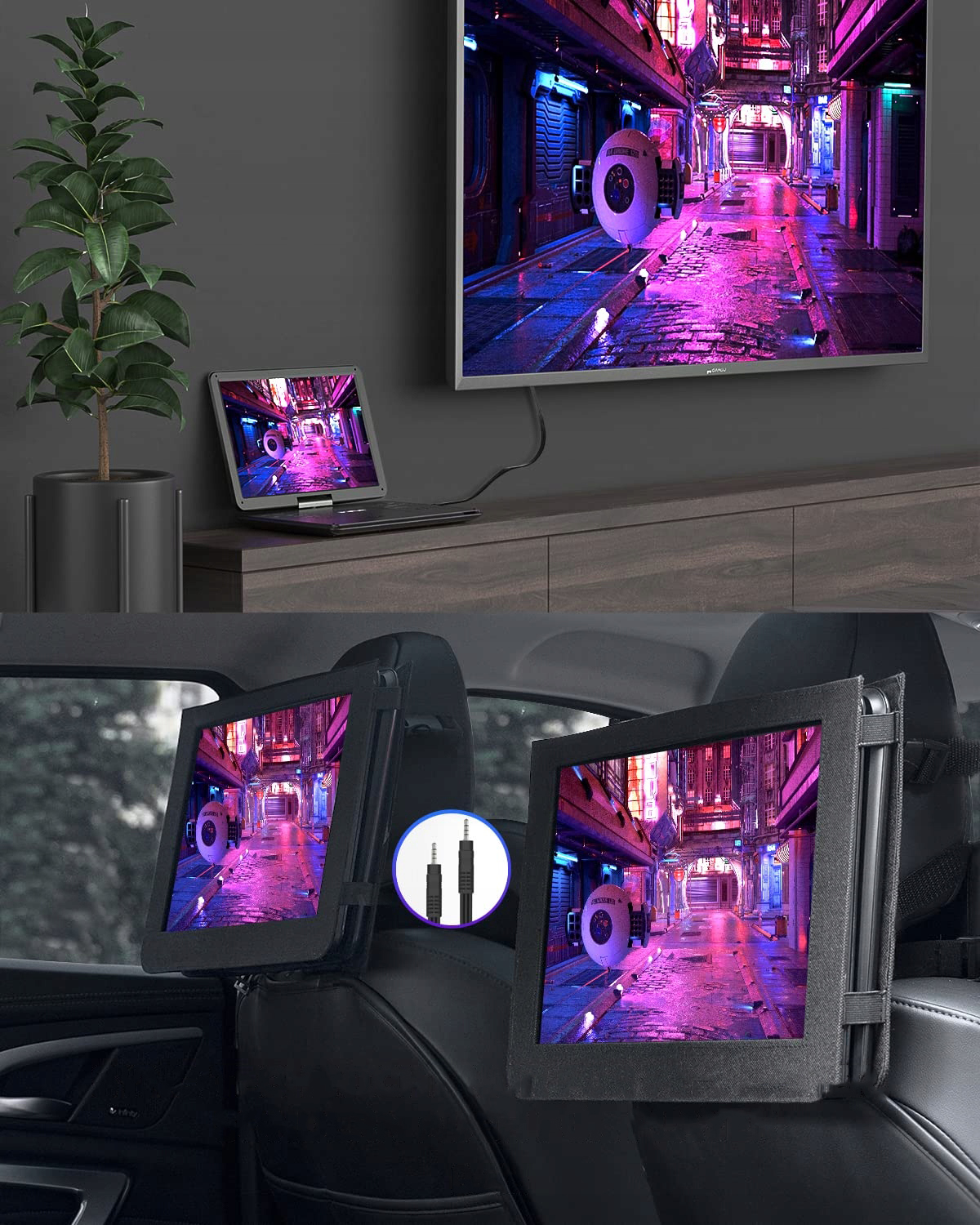 Передача екрана до телевізора: Підключіть програвач та телевізор за допомогою AV -кабелю до RCA (включена). Просто налаштуйте кабельні з'єднання, а потім ляжте на дивані та керувати гравцем за допомогою пульта дистанційного керування, проводячи чудовий вільний час з усією родиною. 3 Додаткові системні систем 6-годинного літієвого акумулятора (час відтворення 2 фільмів) Високоякісний якісний портативний автомобільний зарядний пристрій, що входить до набору 110 В змінного струму, пройшов сертифікацію