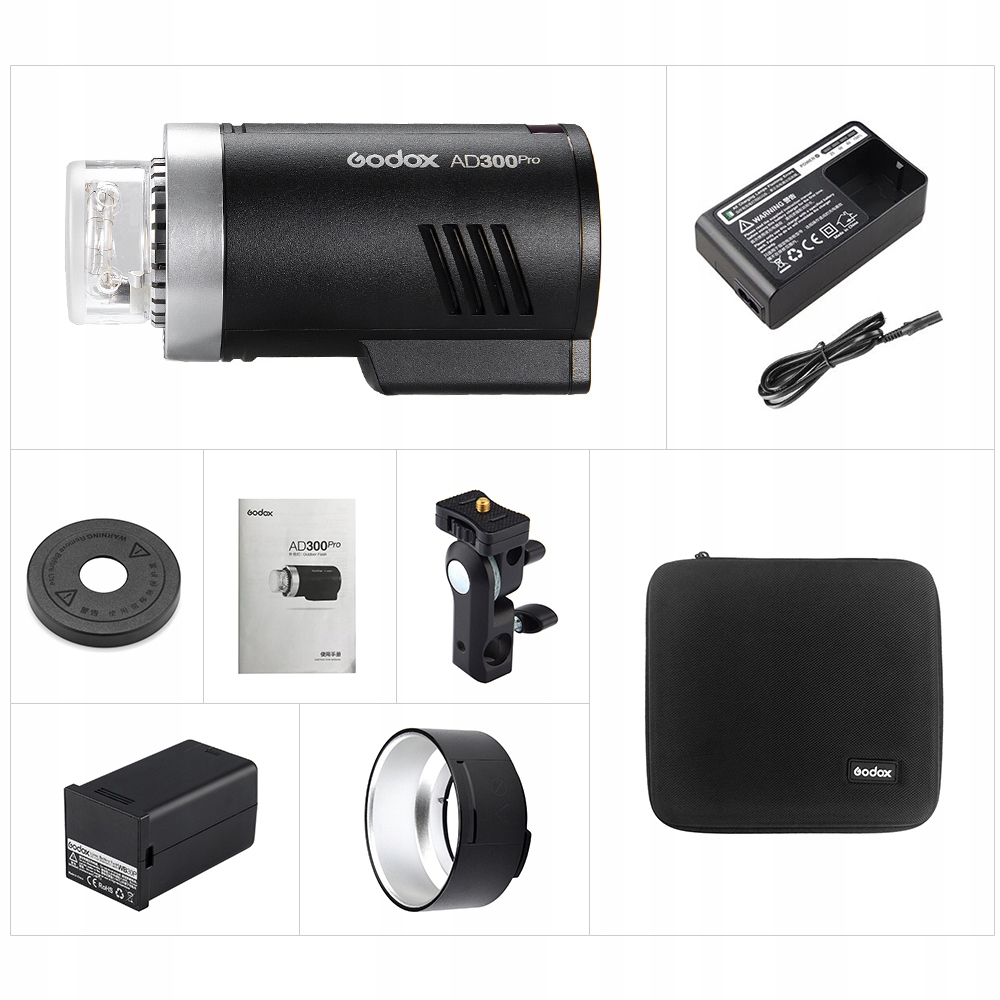Передача бездротової системи 2,4G X: Завдяки вбудованій системі Wireless X Godox 2.4G ви можете отримати управління TTL. Флеш-тригер Godox FT-16 також може бути використаний для бездротового регулювання рівня спалаху та звільнення спалаху. AD300PRO має 3,5 -мм синхронізаційний кабель для отримання різних тригерів синхронізації. За допомогою повної потужності спалах може досягти 320. Акумулятор може бути повністю заряджений менш ніж за 2,5 години.