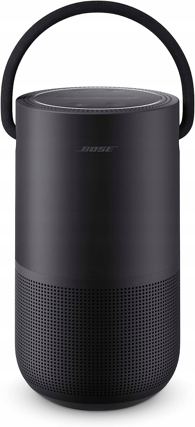Портативна домашня колонка Bose Speaker - бездротова домашня колонка на основі зв'язку Bluetooth і Wi-Fi. Міцний, вологостійкий пристрій важить 1,06 кг і має простий мінімалістичний дизайн - матовий чорний корпус. Ми можемо використовувати ручку у верхній частині колонки, щоб зручно її носити або повісити в потрібному місці. Максимальний час відтворення музики – до 12 годин. Після того, як акумулятор розрядиться, його можна зарядити протягом чотирьох годин за допомогою кабелю живлення USB Type-C, під’єднаного до настінного зарядного пристрою.