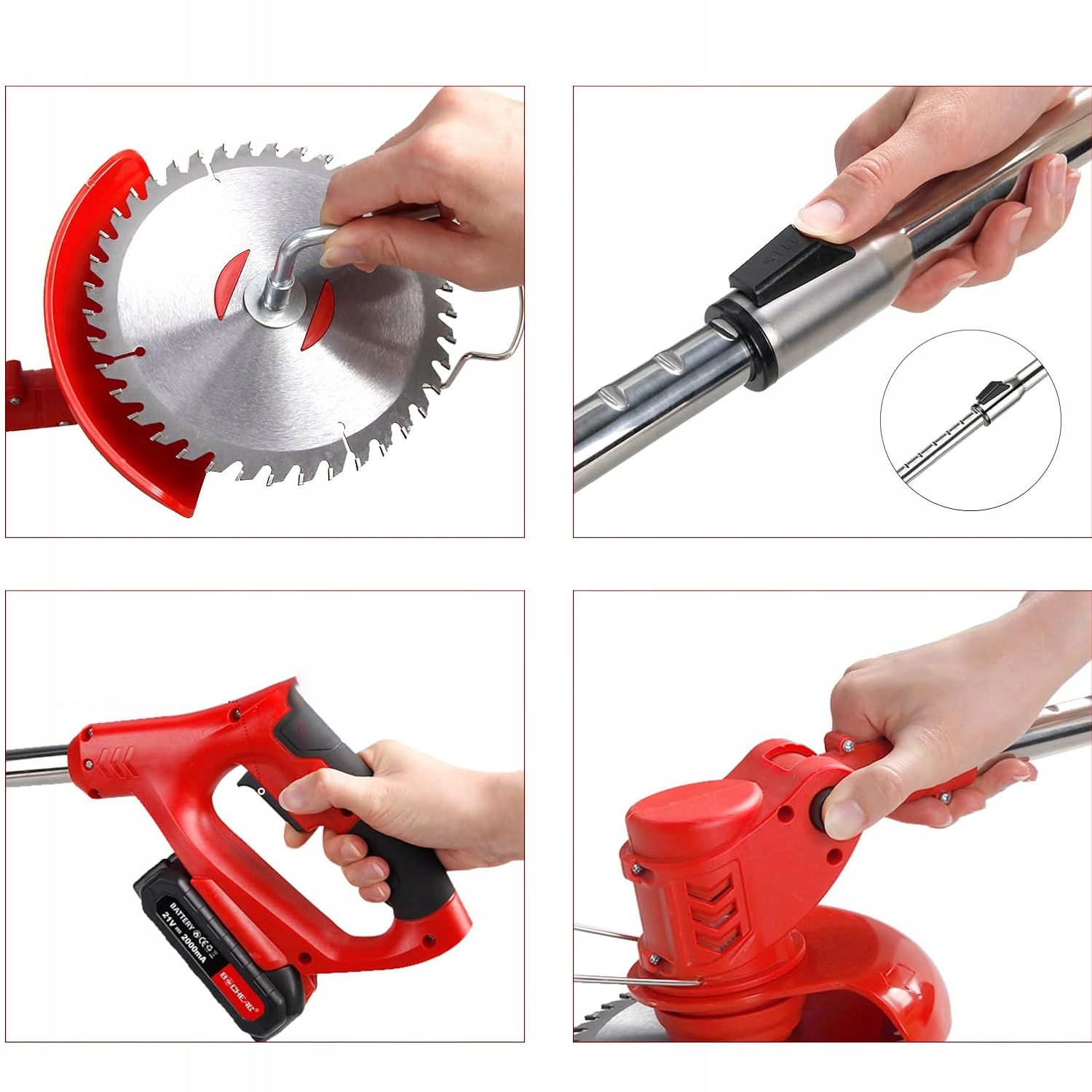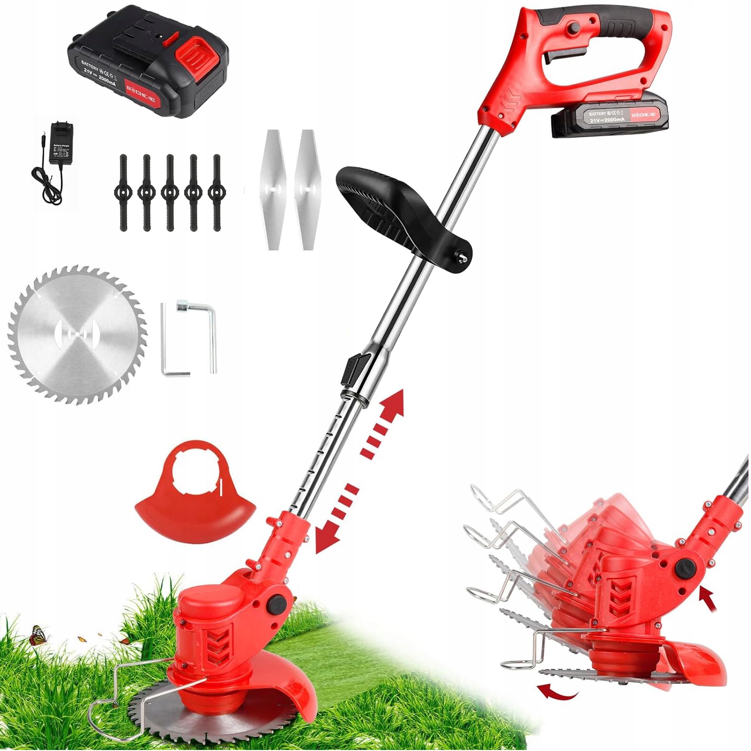 - ⚡ - Оснащено 3 типами пильних полотен, 1 кругле полотно з марганцевої сталі (підходить для підстригання густих гілок кущів), 2 леза з нержавіючої сталі (підходять для швидкого підстригання трави, бур’янів і невеликих кущів), 5 нейлонових лез (підходять для підрізання молодої трави).