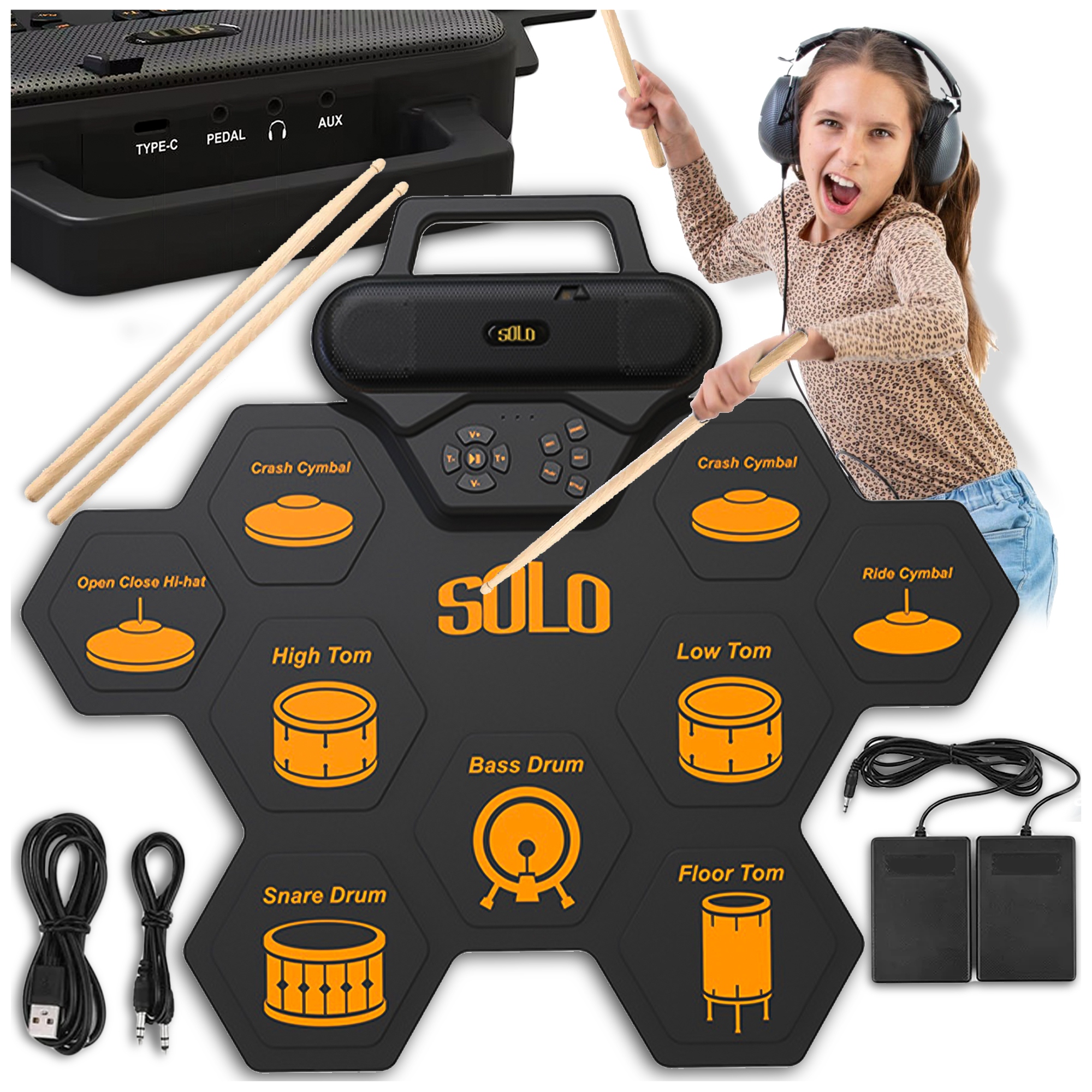 ПОРТАТИВНА ЕЛЕКТРОННА БАРАБАННА УСТАНОВКА USB-C + НАБІР ПЕДАЛЕЙ ТА ПАЛИЦЬ