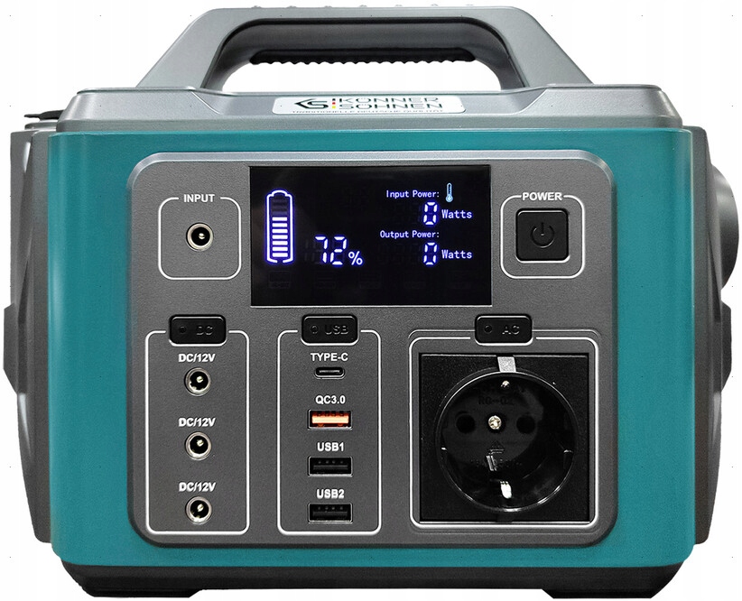Портативна електростанція Konner & Sohnen KS 300PS має міцний корпус із міцного ABS-пластику, що гарантує тривале використання. Чохол має зручну і практичну ручку для перенесення, що дозволяє брати пристрій практично куди завгодно. Станція має кольоровий світлодіодний дисплей, який оснащений багатьма індикаторами, що показують усі найважливіші функції. Цікавим доповненням є вбудована яскрава світлодіодна лампа з трьома режимами: увімкнено, блимання та режим SOS, що може бути корисним у багатьох ситуаціях на вулиці. Машина оснащена високоякісними літієвими акумуляторами, які мають тривалий термін служби. Він також має вбудовану систему керування акумулятором (BMS), керовану процесором інтелектуального керування енергією. Станцію можна використовувати для живлення різних електронних пристроїв завдяки 9 портам: 3 порти постійного струму, 1 порт змінного струму, 4 порти USB і 1 стандартна автомобільна розетка. Довговічна і безпечна робота машини забезпечується рядом засобів захисту, тобто захист від перезаряду, перевантаження, перенапруги, короткого замикання і надмірного розряду. Станцію KS 300PS можна заряджати від розетки 230 В (кабель для зарядки в комплекті) і від автомобільного прикурювача 12 В (кабель в комплекті). Крім того, для зарядки можна використовувати сонячну панель.