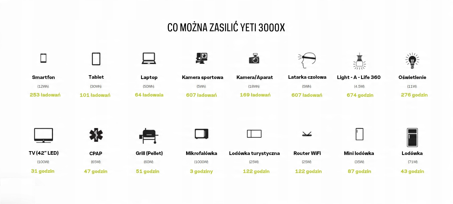 Електростанція Goal Zero Yeti 3000X дає вам величезні можливості. Оснащений мережевою розеткою 230 В, 12 В і 4 портами USB (2x USB-A, 1x USB-C і 1x USB-PD) дозволяє нам живити все, що вам потрібно. Ви можете живити кілька пристроїв одночасно! Побутова електроніка, побутова техніка, газові печі, медичне обладнання та навіть електроінструменти. Все було створено в системі Plug&Play, тому все, що вам потрібно зробити, це вставити штекер у відповідний порт.