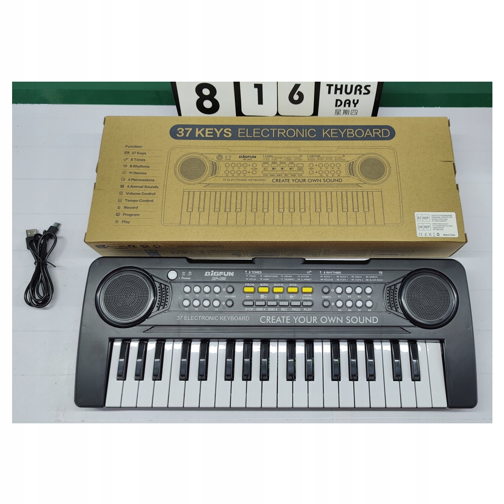 🎶- Вбудовані 37 клавіш, 8 тонів, 8 ритмів, 11 демонстраційних версій, 4 ударні інструменти, 4 звуки тварин, регулятори гучності та ритму.