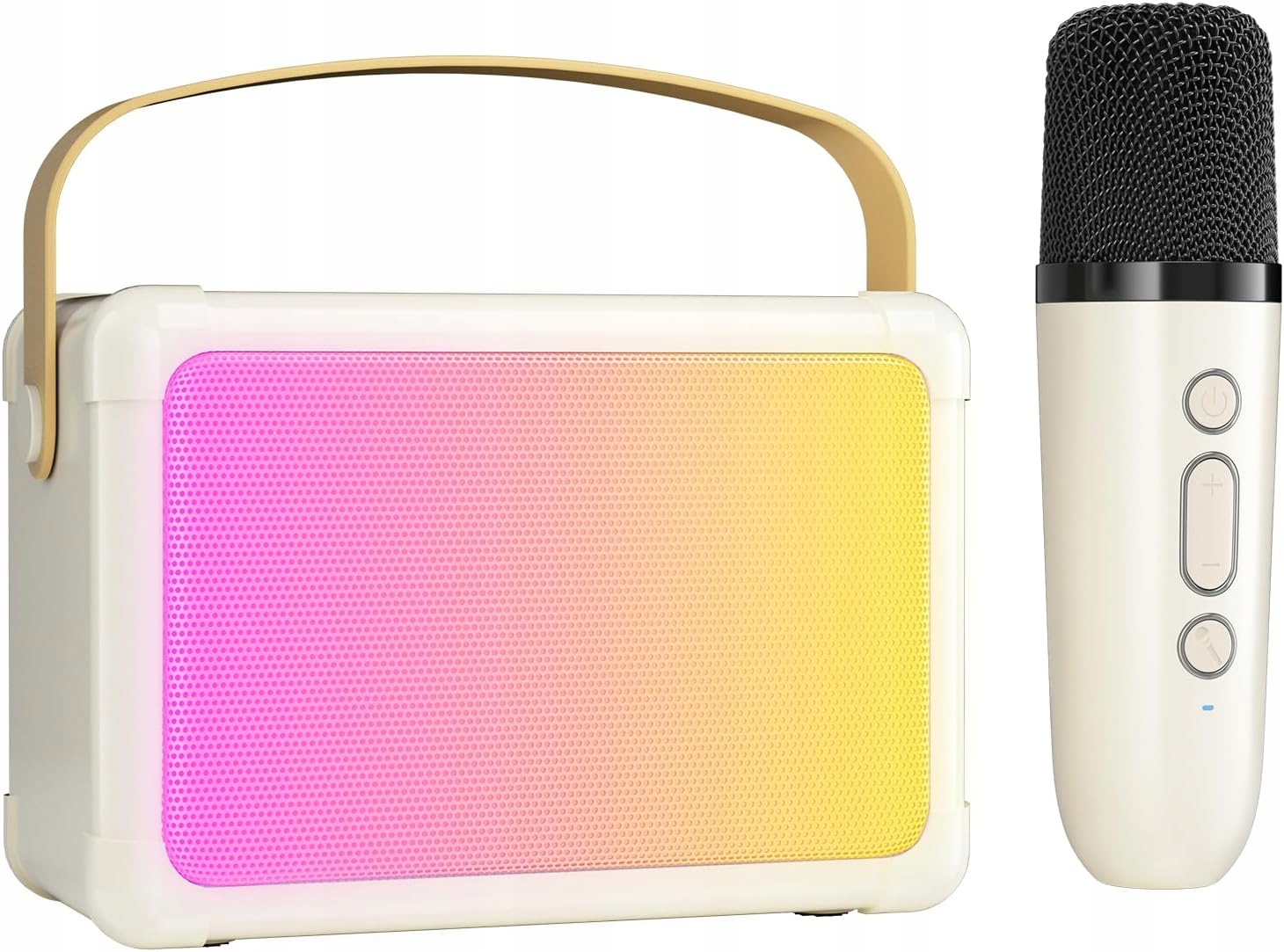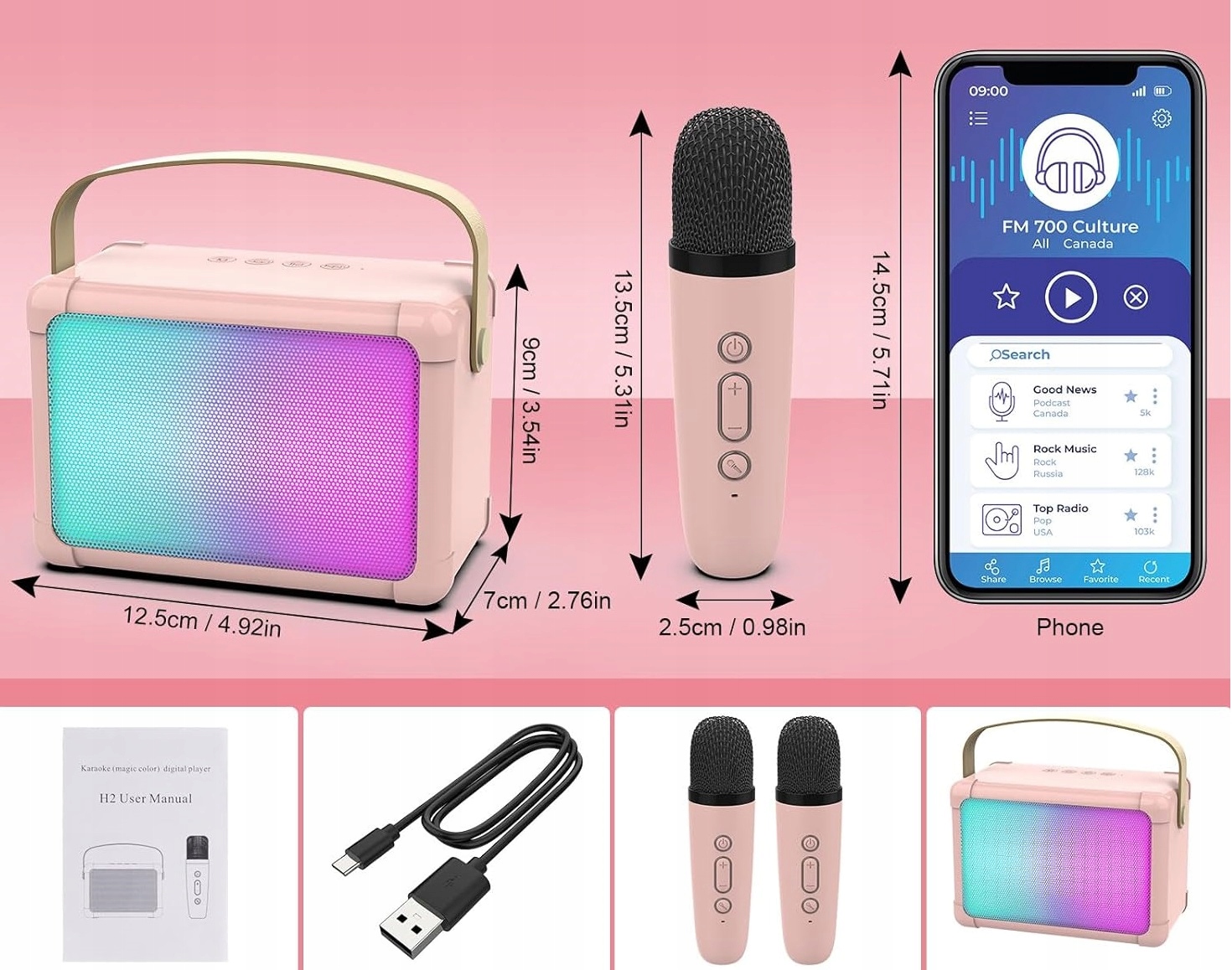Динамік караоке використовує 40-міліметровий динамік, якість звуку HiFi, глибокі баси та об’ємне 3D-стерео, що забезпечує більш реалістичну текстуру музики. Набір оснащений якісними мікрофонами
