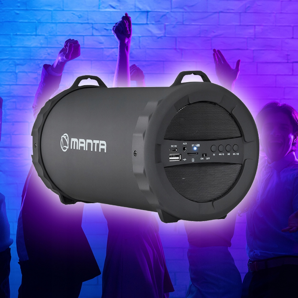 Manta Pipe SPK204FM – це мобільний пристрій, який ви можете брати з собою на вулицю завдяки вбудованому акумулятору та прикріплений ремінь для ще більшої зручності пересування.