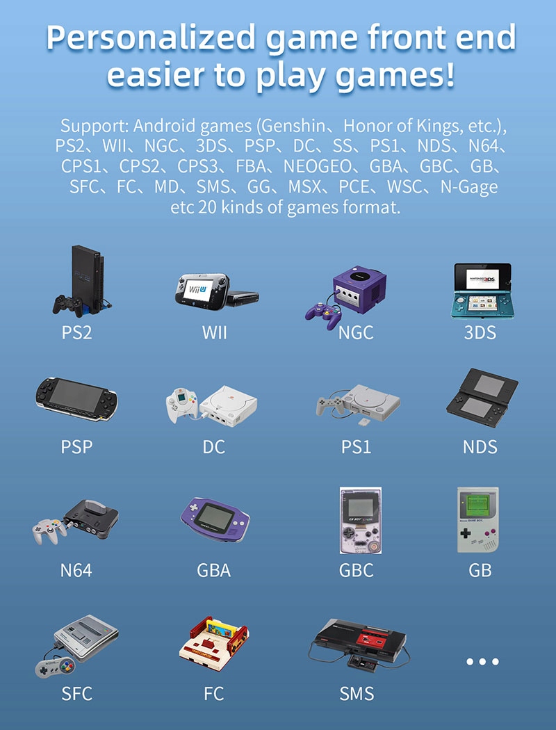 Підтримка : ігри для Android (genshin impact, Honor of Kings тощо),PS2, WII, NGC, 3DS, PSP, DC, SS, PS1, NDS, N64, CPS1, CPS2, CPS3 , FBA, NEOGEO, GBA, GBC , GB, SFC ,FC, MD, SMS, GG, MSX, PCE, WSC, N-Gage та понад 20 ігрових форматів. Підтримуйте користувачів завантажувати ігри у відповідних форматах.
