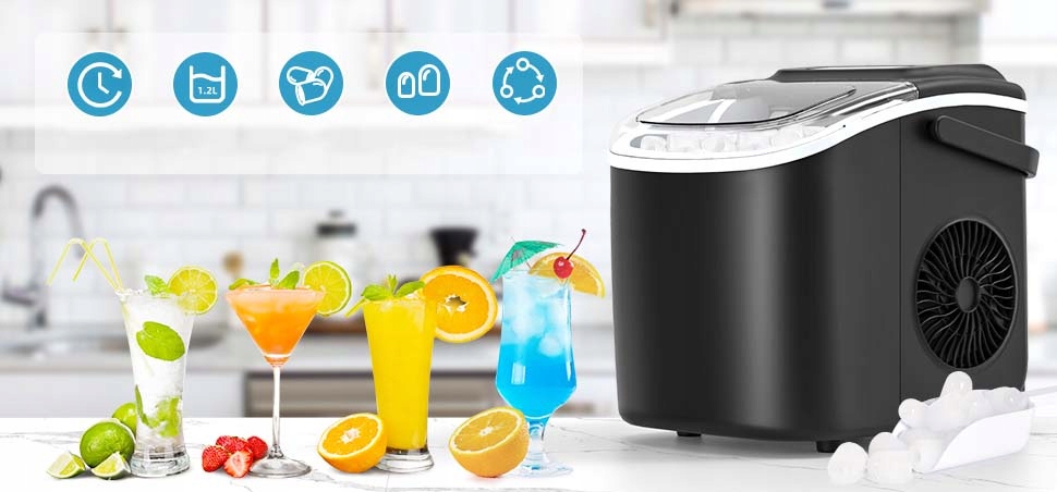 - Нашій маленькій міні-крижаній кулі потрібно лише 6 хвилин, щоб зробити 9 сферичних кубиків льоду. Вилийте 1,2 літра води в резервуар для води, максимальна ємність льоду може досягати 12 кг протягом 24 годин .