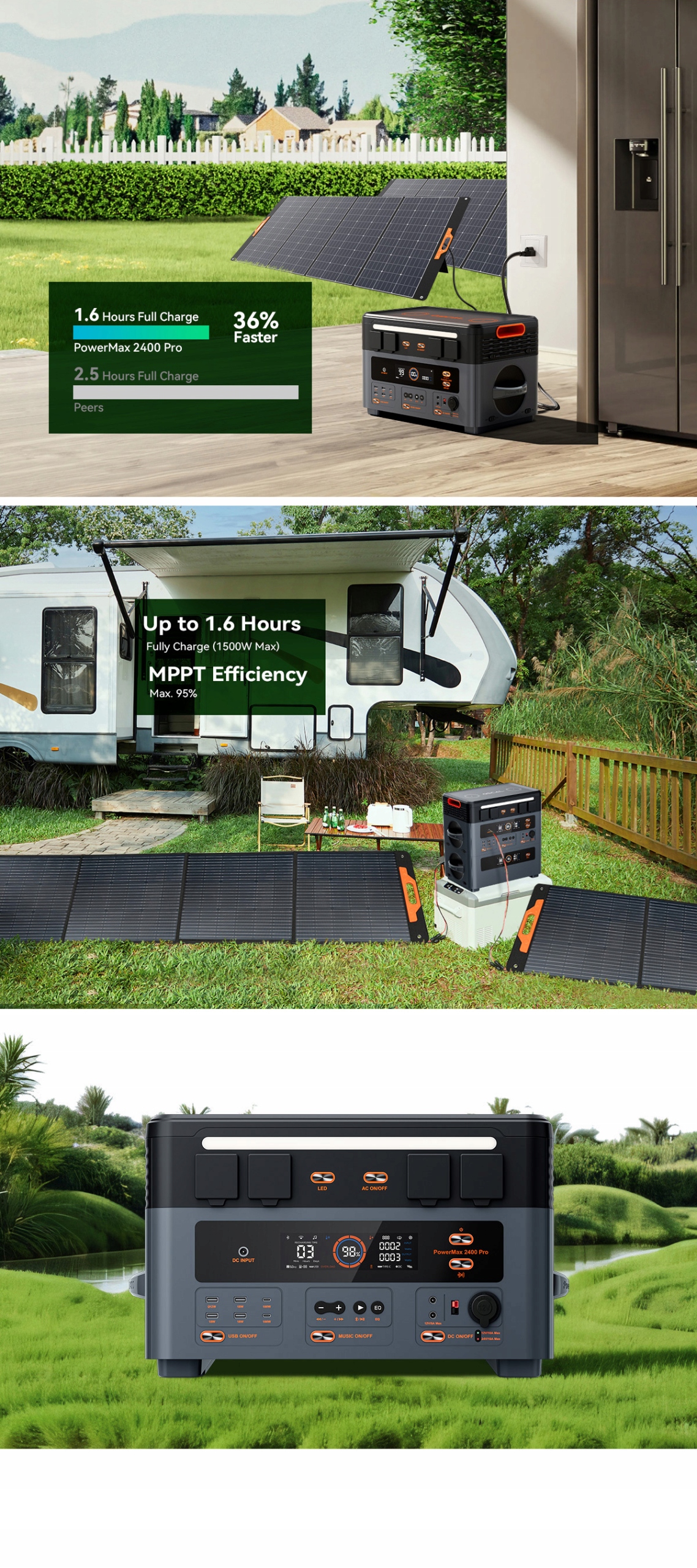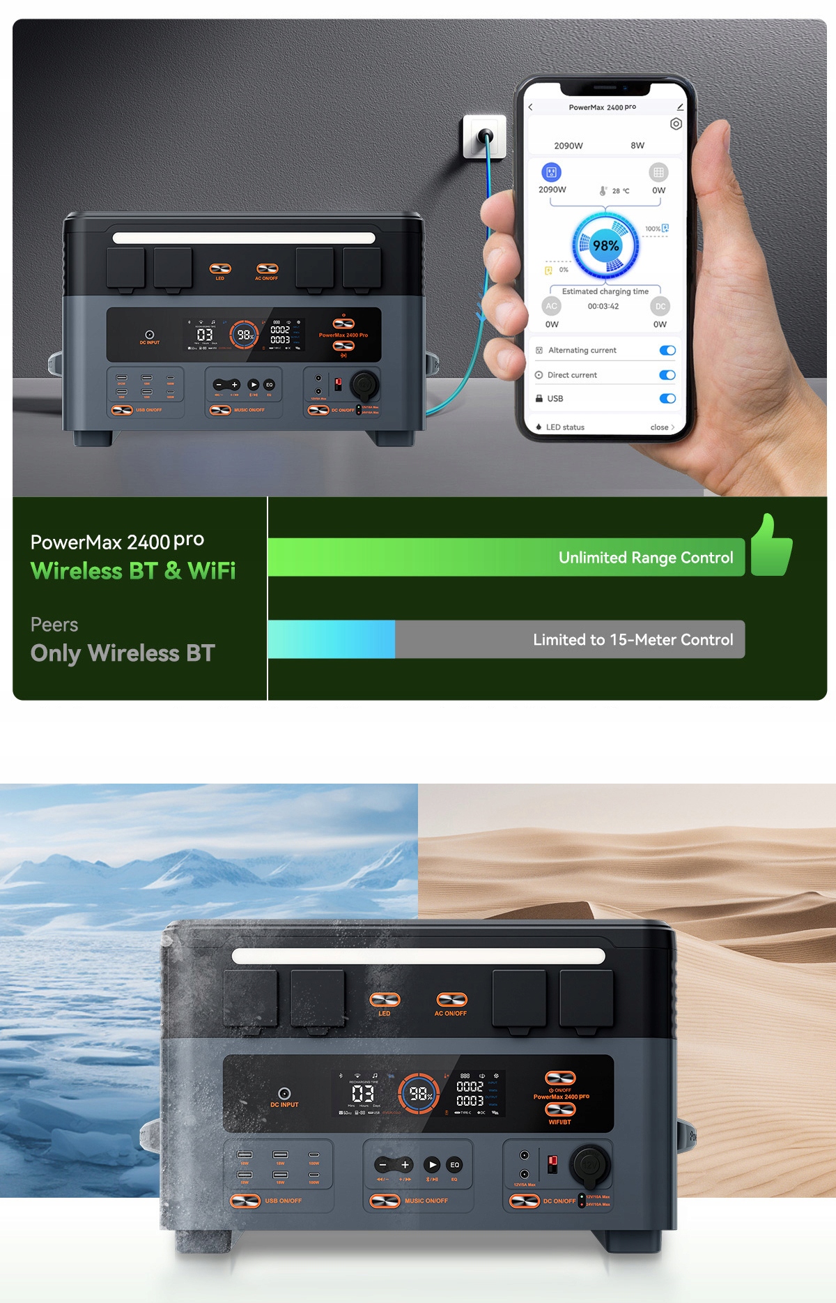 Залишайтеся живими та вільними з PowerMax 2400 Pro. Його потужна вихідна потужність 2400 Вт може живити 99% домашніх пристроїв, що робить його ідеальним для кемпінгу, аварійного відключення електроенергії та проектів на природі. Незалежно від того, де ви знаходитесь, у вас все під контролем.