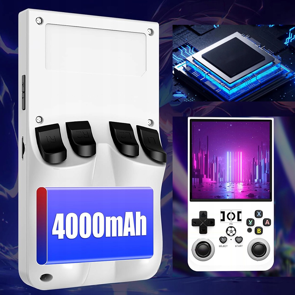 Ігрова консоль R36MAX може похвалитися акумулятором ємністю 4000 мАг, який забезпечує до 8 годин безперервної гри після всього 2 годин швидкого заряджання. Компактний дизайн робить його легким і портативним, дозволяючи безперервно грати під час довгих поїздок або щоденних поїздок. Оснащений динаміками потужністю 8 Вт і роз’ємом для навушників 3,5 мм, ви можете поринути у світ ігор наодинці або поділитися захоплюючими моментами з друзями.