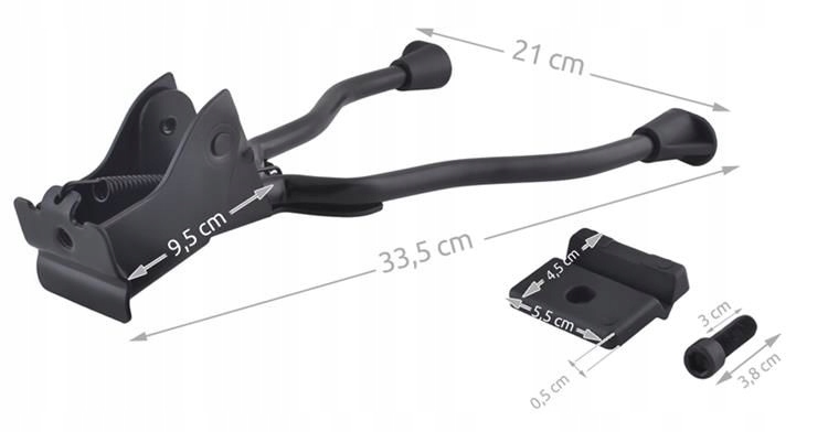 Подвійна металева велосипедна підставка для кріплення до задньої частини велосипеда (між заднім колесом). Центральне кріплення, з гвинтом. У комплект входить розпірна шайба, яка захищає велосипед від подряпин під час складання ніжки та піднімає ніжку ( шайбу можна зняти).