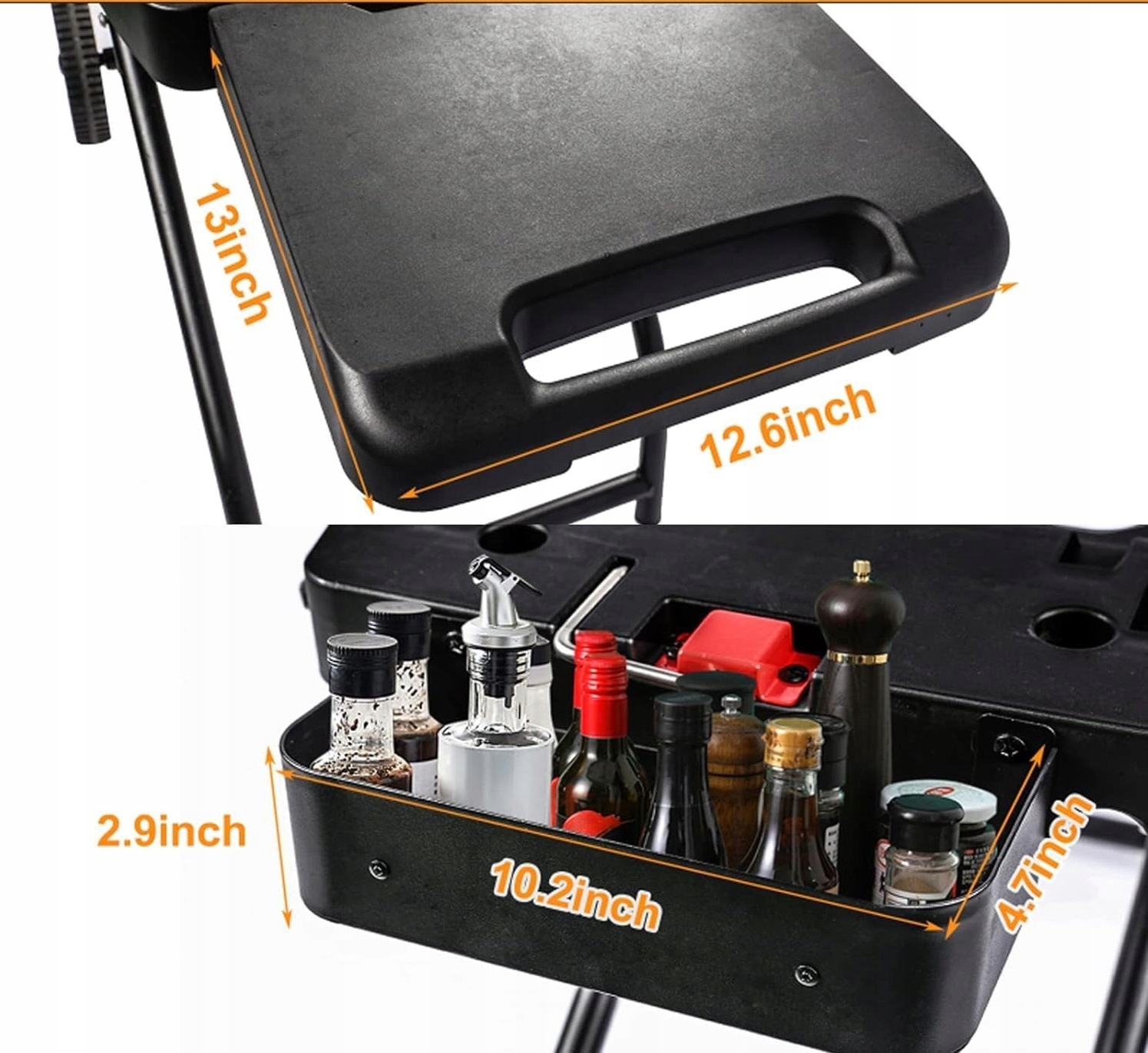 【Зручне зберігання】 Полиця для барбекю можна використовувати для приготування посуду або розміщення аксесуарів для барбекю, таких як спеції, тертя та соуси під час приготування. ► Кошик праворуч можна використовувати для зберігання пляшки зі спеціями, очисного паперу та аксесуарів для легкого доступу. ► На передній частині є 6 гачків, щоб призупинити гриль.