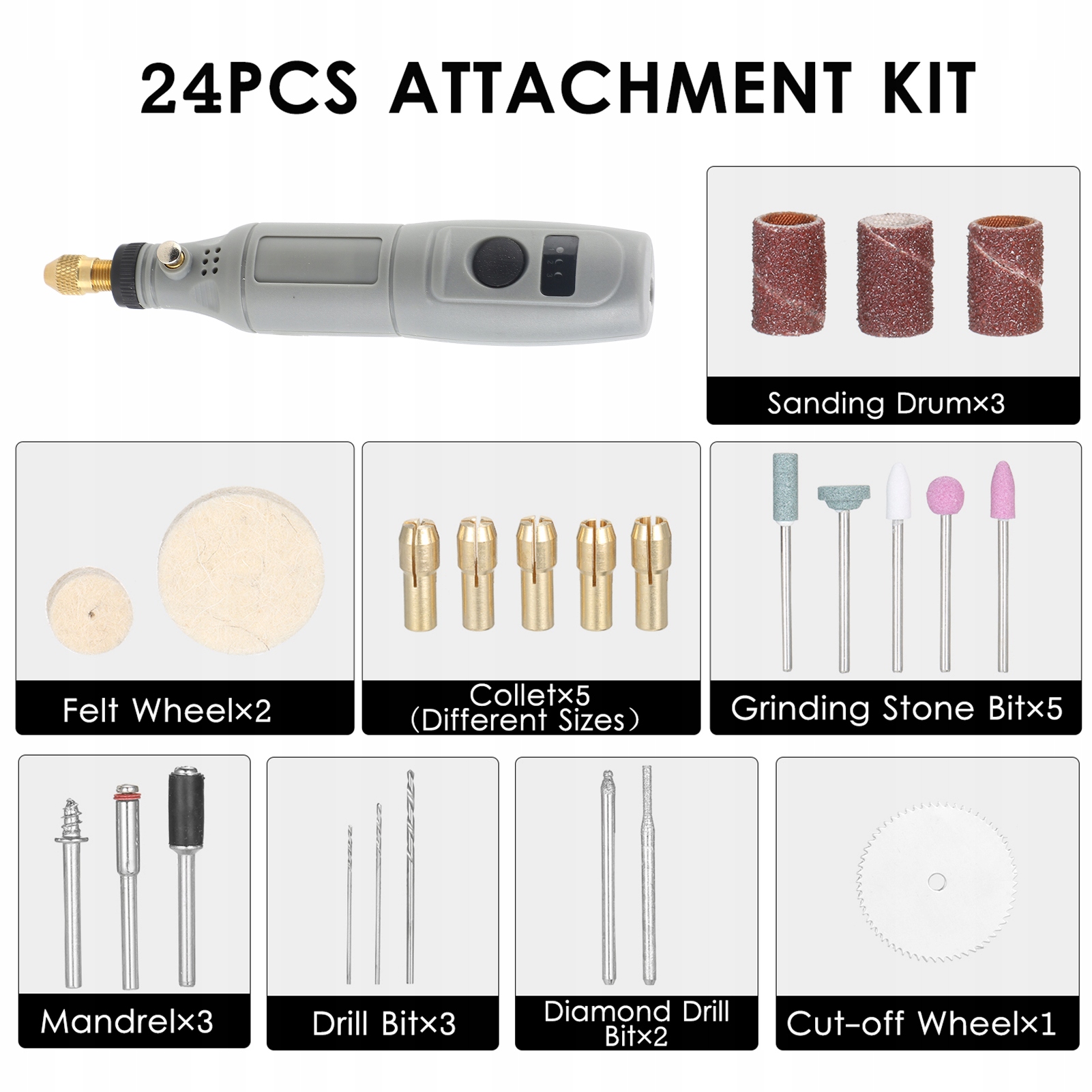 - Набір для рукоятки з 24 шт.: поставляється з насадками з 24 частин, які зберігаються в невеликій пластиковій коробці, яка включає різні типи свердел, шліфувальних насадок для каменю, повстяних кругів, шліфувальних барабанів, відрізного круга, оправок і кодерів.