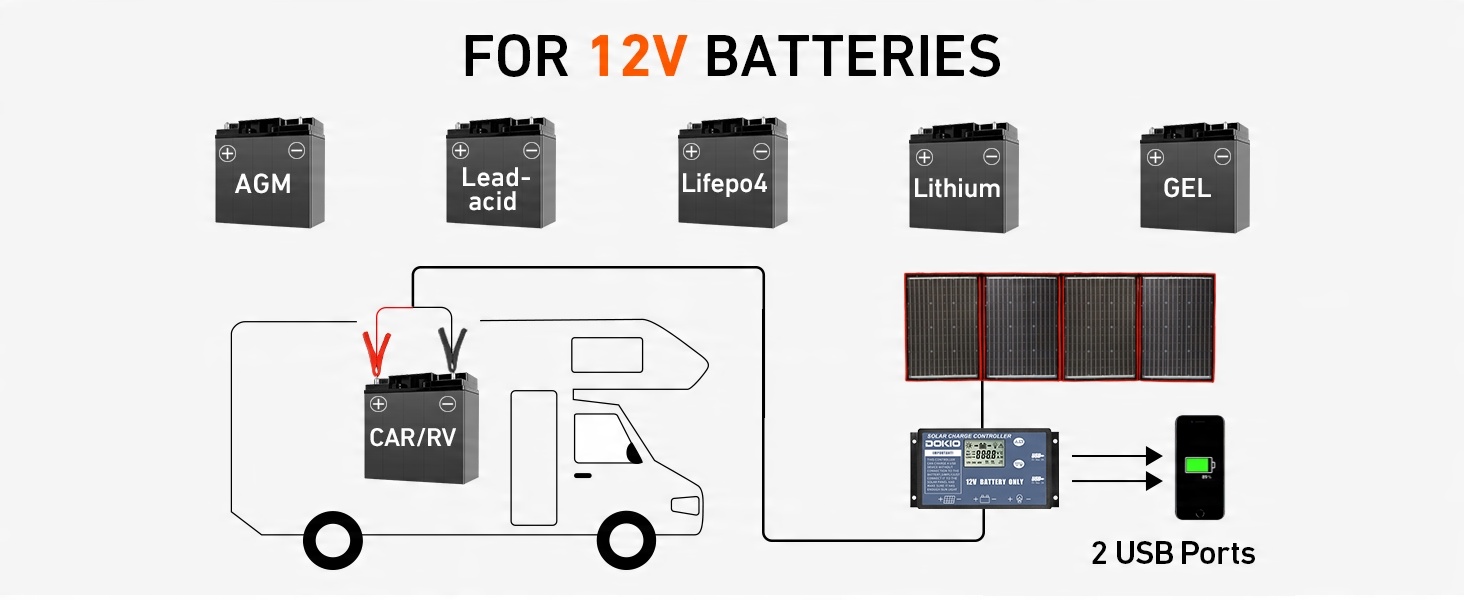 - 【Повний набір, працює прямо з коробки】 - Інтелектуальна ШІМ зарядка Інтелектуальний захист від зворотної полярності, перезаряду, короткого замикання та зворотного струму. Вбудовані USB-порти 5 В 2 А для зарядки USB-пристроїв на телефонах. Якщо ви використовуєте вбудовану станцію MPPT Power Station, немає потреби підключати ШІМ-контролер, що входить до комплекту.