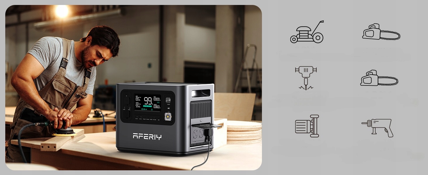 AFERIY P210 забезпечує 2400 Вт вихідного струму змінного струму та велику ємність 2048 Вт·год LiFePO4, забезпечуючи безпечне та тривале живлення вдома надзвичайні ситуації, подорожі на природі та робочі місця.