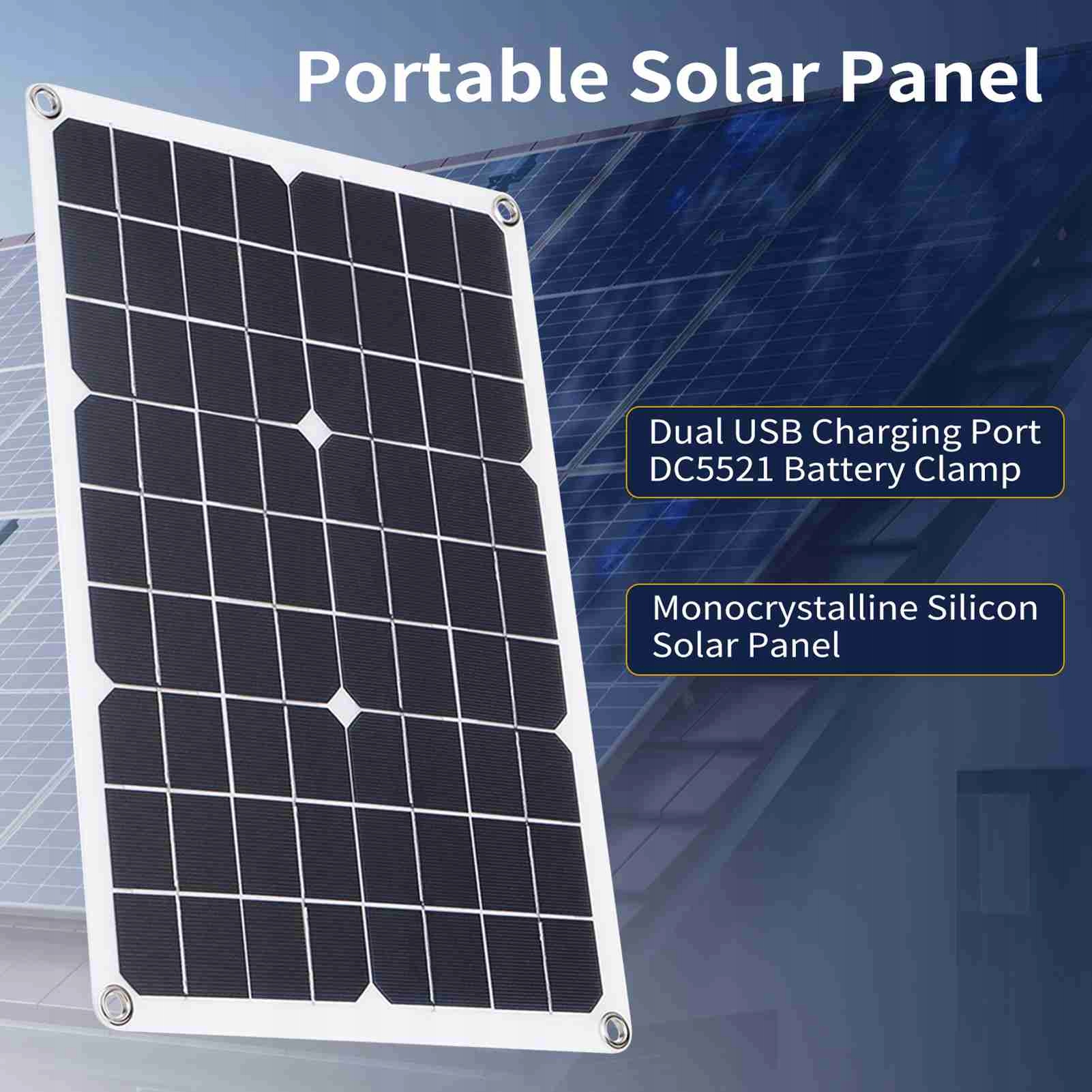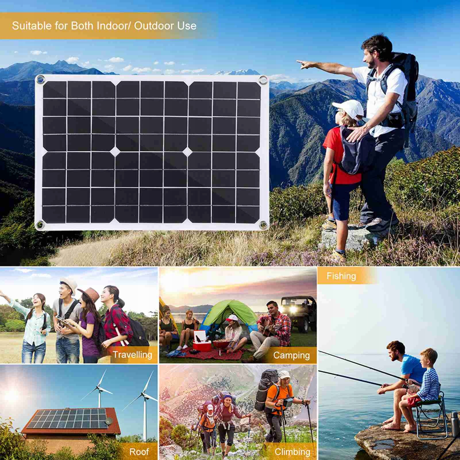 - Багатофункціональний дизайн: оснащено двома портами USB для заряджання та DC5521 акумулятор жіночий інтерфейс, може одночасно заряджати пристрої на 5 В, такі як мобільні телефони та спортивні камери, а також батареї на 12 В для автомобілів, кораблів тощо, що відповідає потребам у зарядці різних пристроїв.