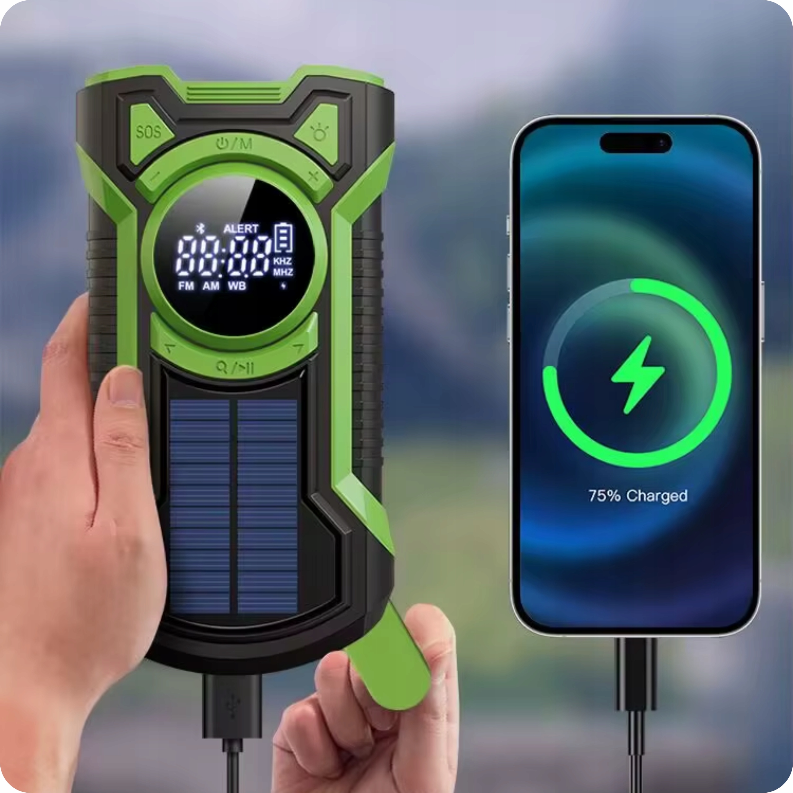 Радіостанція JB-07 — це універсальний пристрій екстреної допомоги, призначений для виживання на природі, у кемпінгу та кризових ситуаціях. Він поєднує в собі функції FM/AM/WB радіо, світлодіодного ліхтарика, SOS-будильника та зарядного пристрою на 5000 мАг. Завдяки рукоятці та сонячній панелі він працює навіть без доступу до електрики.