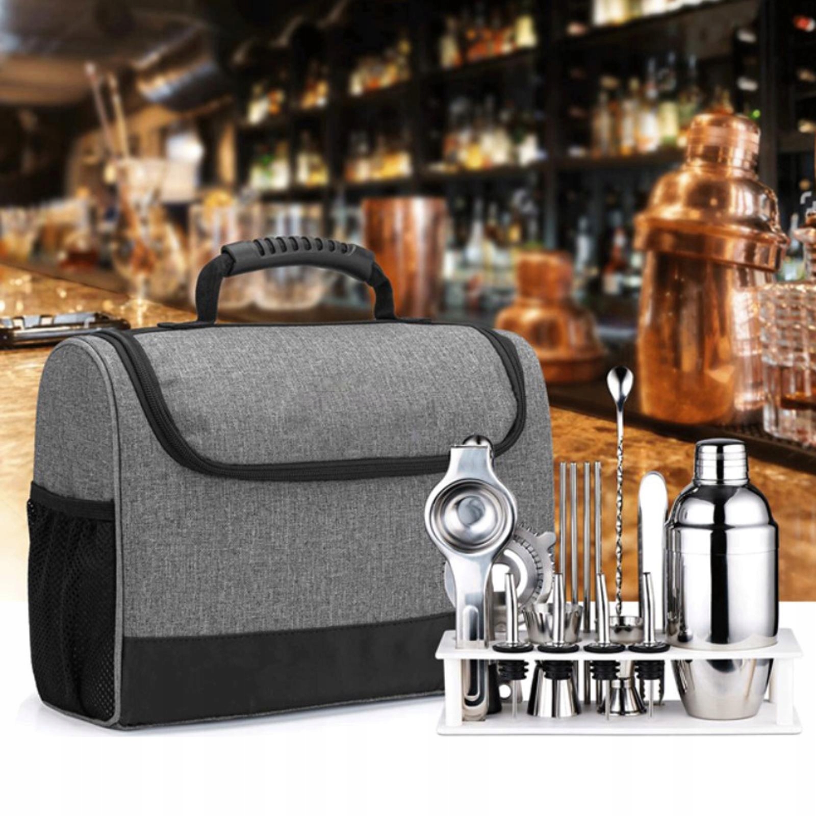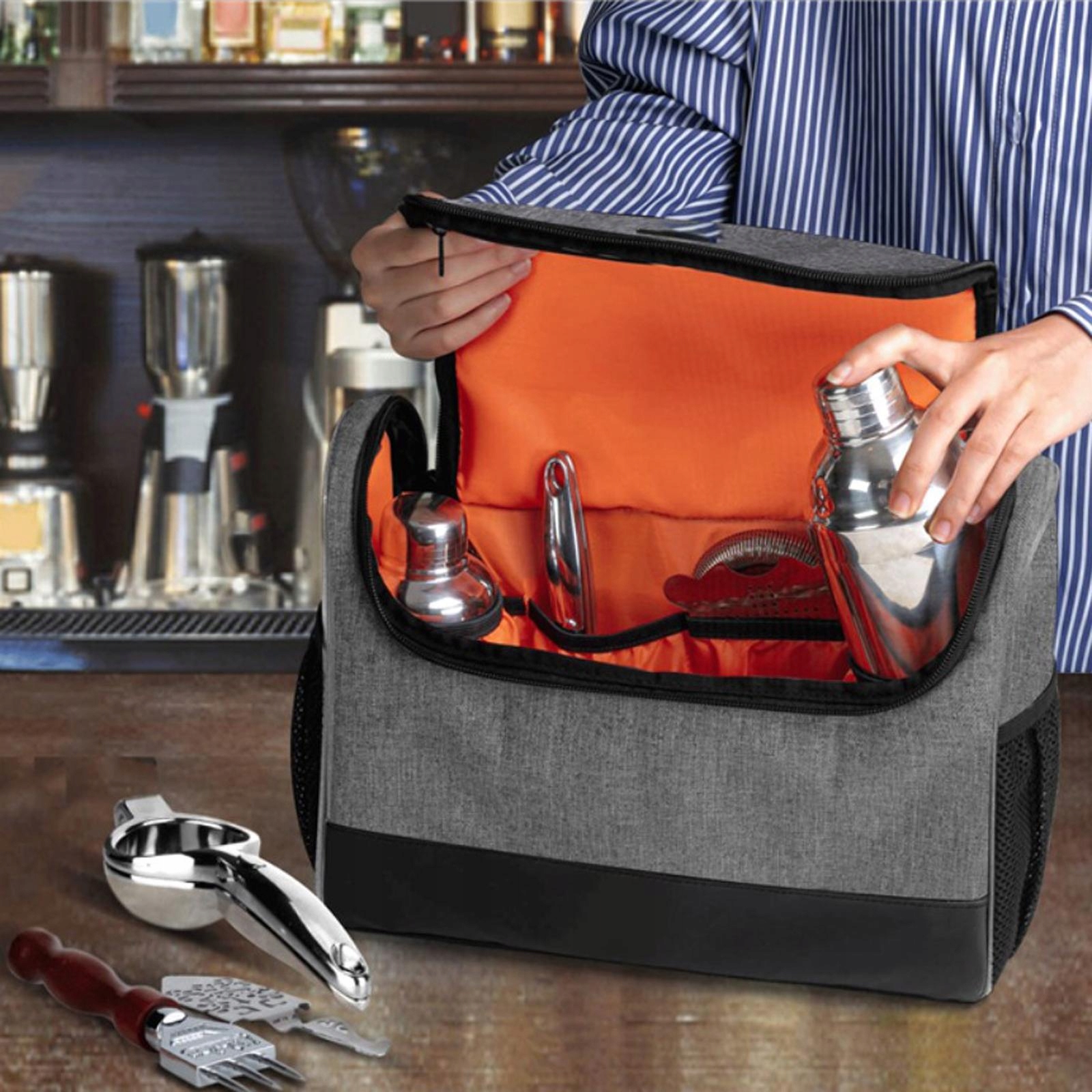 Основний має кілька верхніх кишень для вашого набору інструментів для бару, включаючи коктейльний шейкер, двосторонню мірну чашку, щипці, товкач, ложку для змішування, ситечко, відкривач для пляшок тощо