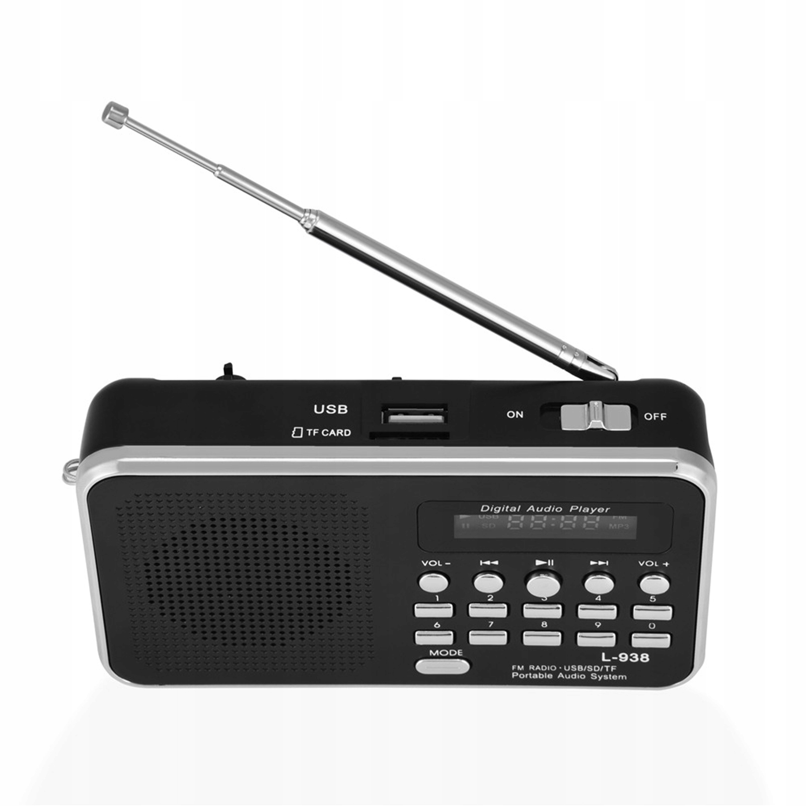 Може відтворювати файли MP3 з флеш-накопичувача USB, картки TF, карти SD/MMC. З функцією радіо Super FM, частота 87,5-108 МГц.