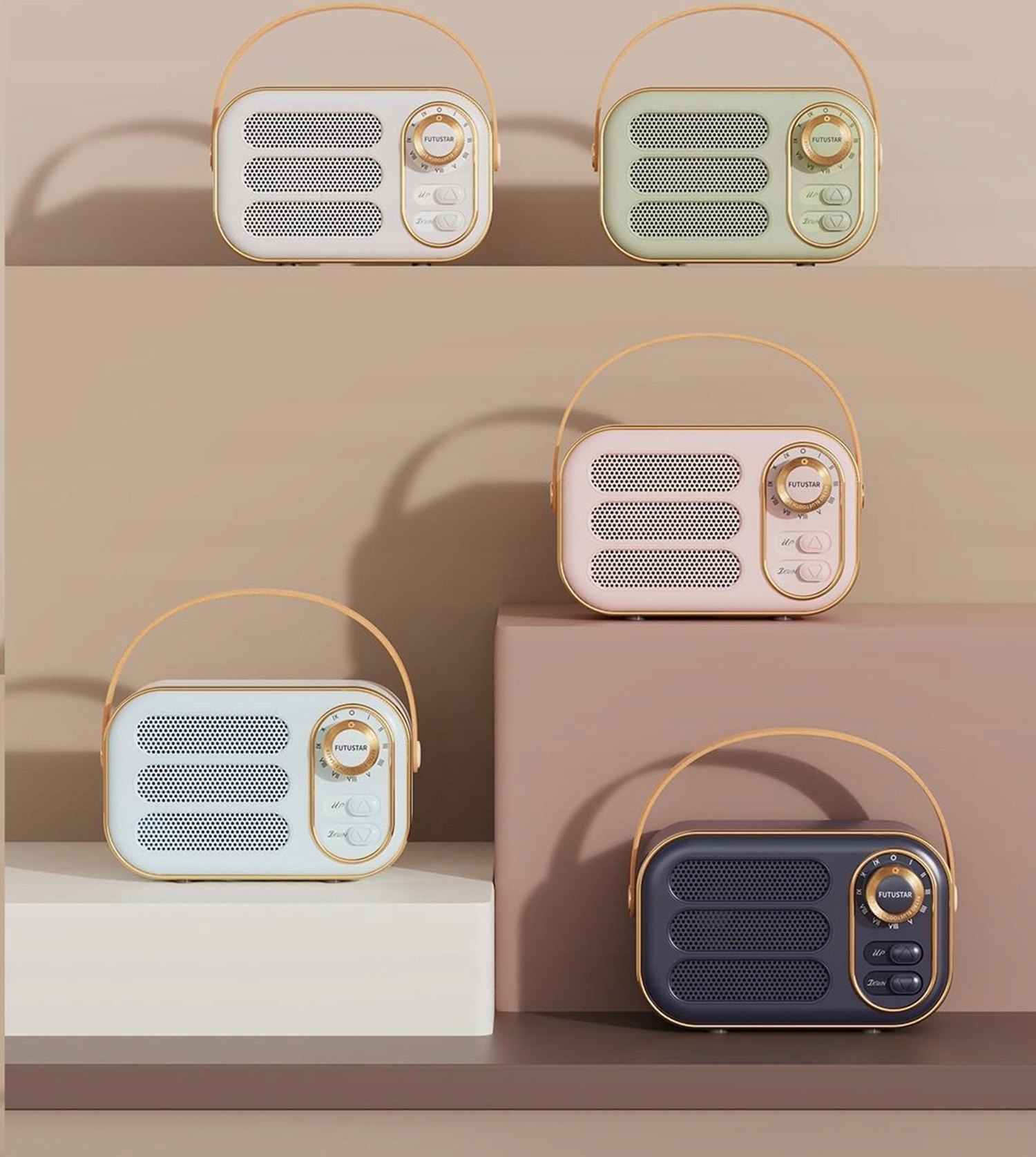 Портативна колонка Bluetooth в елегантному ретро-чохлі зі шкіряними ручками, позолоченими краями та великою ручкою у вінтажному стилі.