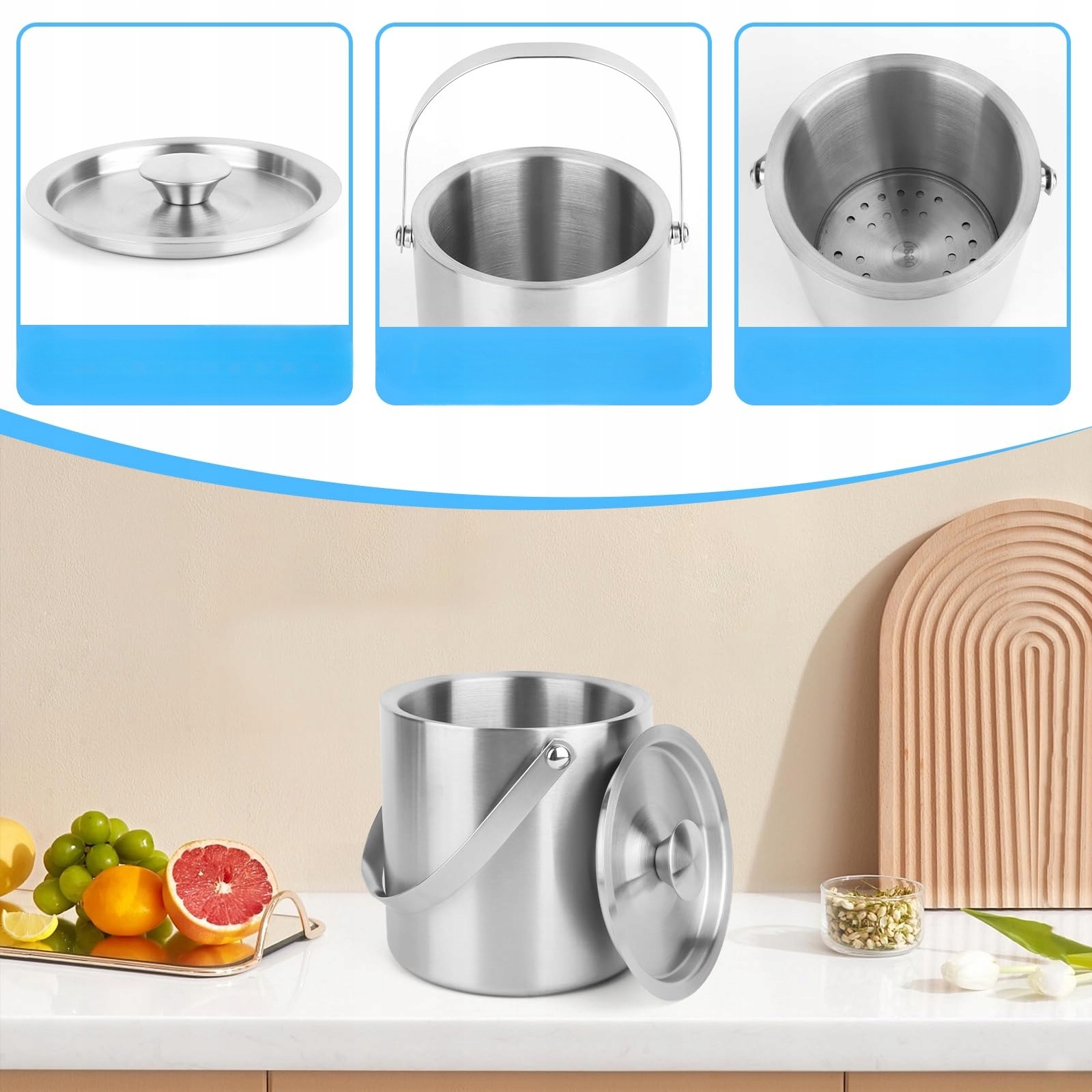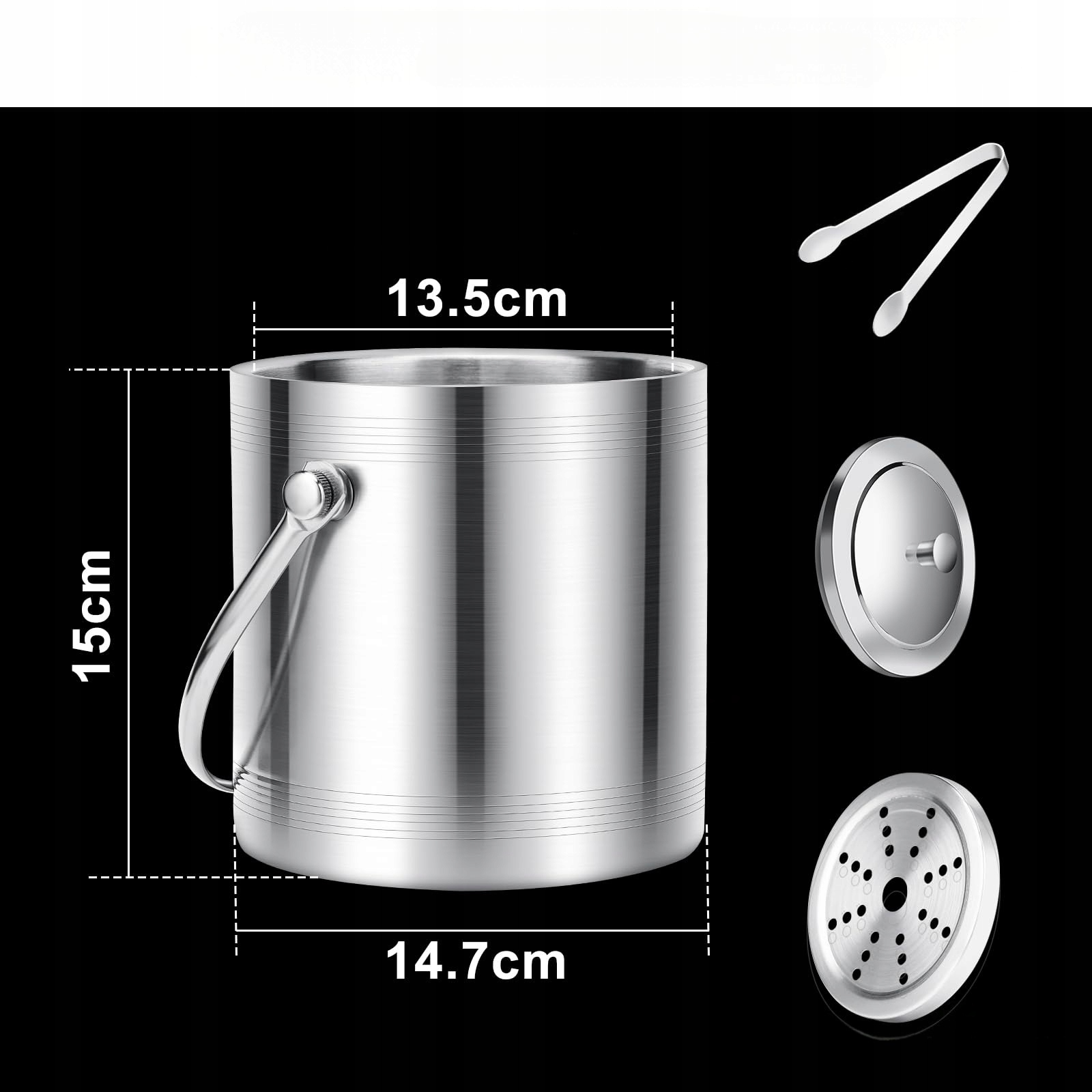 - Відро з подвійними стінами для льоду виготовлено з нержавіючої сталі, з кришкою та крижаною кришкою. Затягніть кубики льоду, уникаючи прямого контакту з кубиками льоду руками. 4