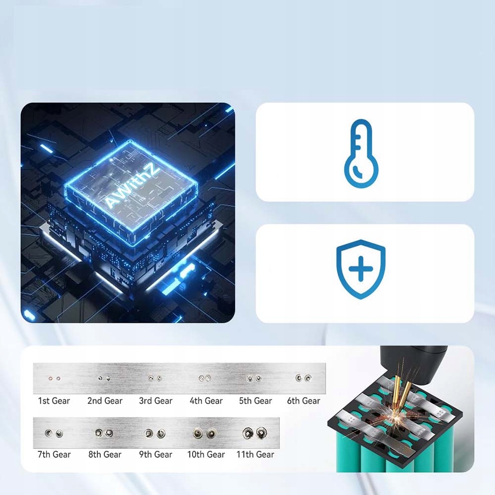 Точкова зварювальна машина має 11 регульовану вихідну потужність, яка може бути адаптована до різних матеріалів. Від 1 до 3 він доступний для акумулятора гарнітури, від 3 до 6 для нікельських пластин товщиною 0,1 мм, від 6 до 11 для пластин з нікелю з товщиною 0,12-0,15 мм. Зварювальна машина - це пристрій для виготовлення точкового зварювання протягом 200 разів за один заряд, що дозволяє отримати велику кількість роботи без необхідності пристрою.