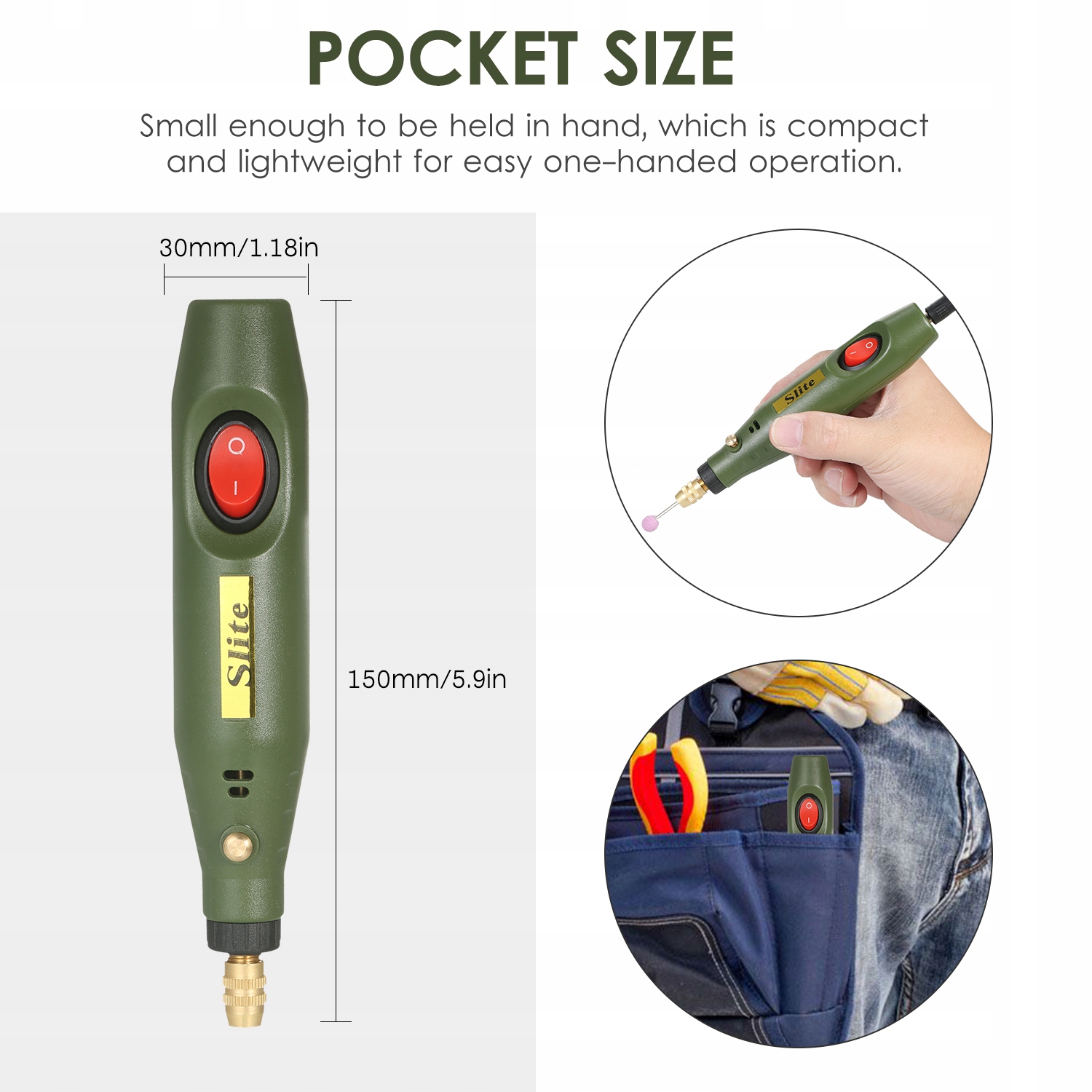 - Ротаційний інструмент невеликий і потужний, включаючи 18000 обертів за хвилину та багато аксесуарів, що значно полегшує виконання точної роботи та допомагає обережно працювати з компактними та крихкими предметами.