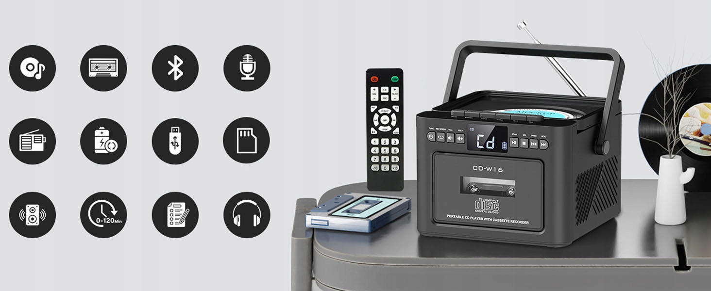 - Портативний програвач компакт-дисків — ідеальний подарунок для родини та друзів. Це ідеальний музичний компаньйон на кухні, у спальні або під час активного відпочинку. Завдяки тонкому дизайну та різноманітним функціям це продуманий і практичний вибір для подарунка.