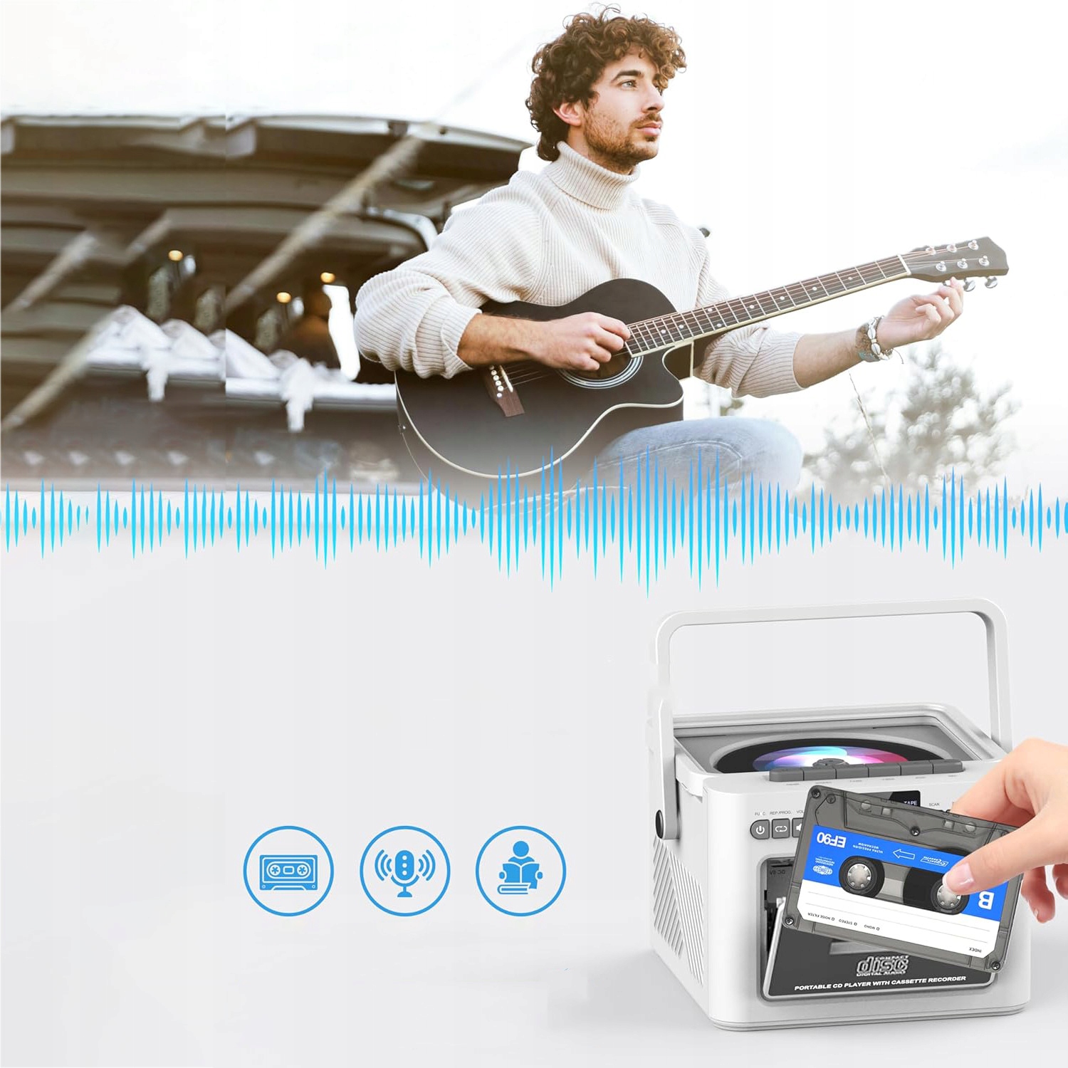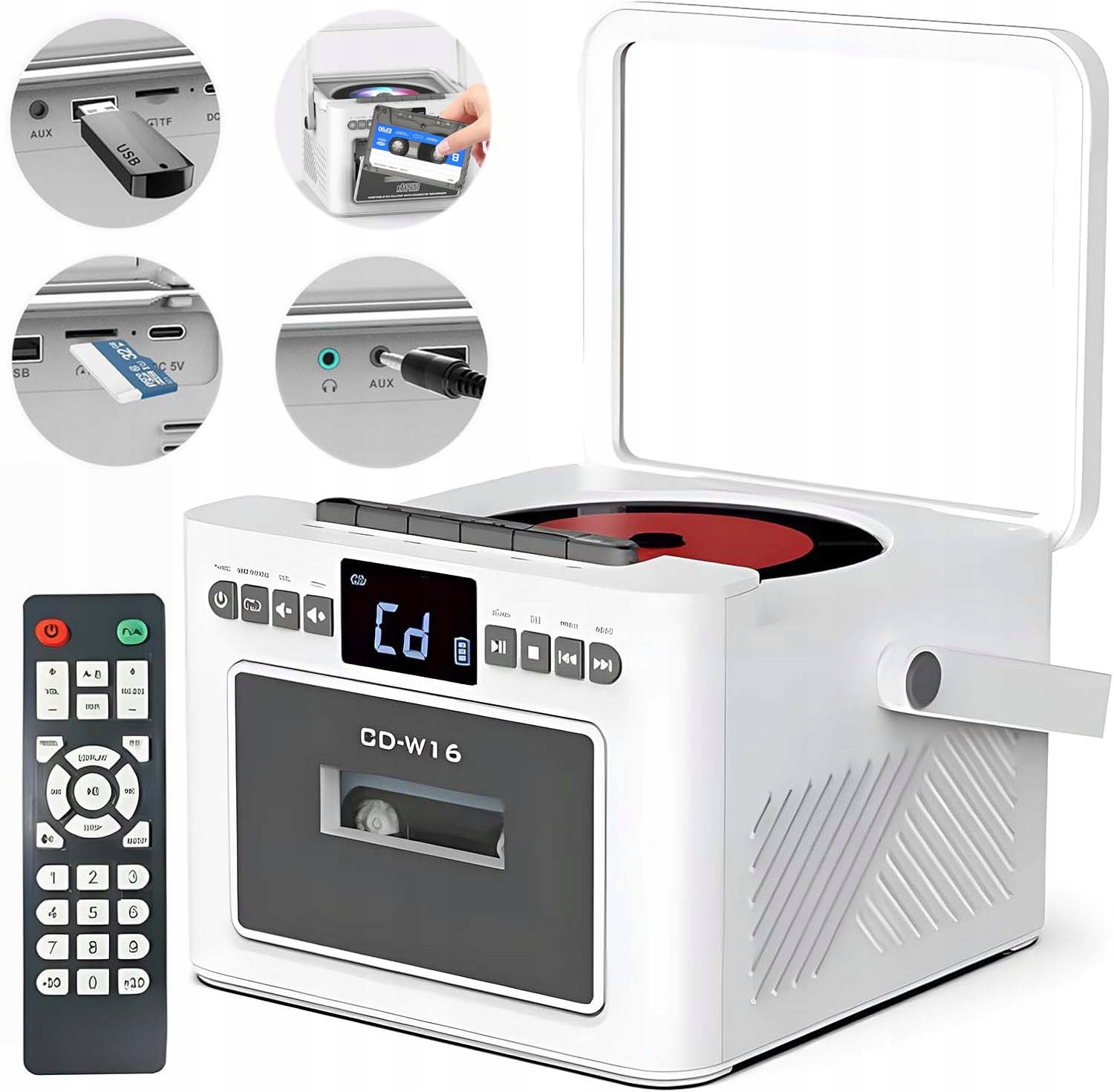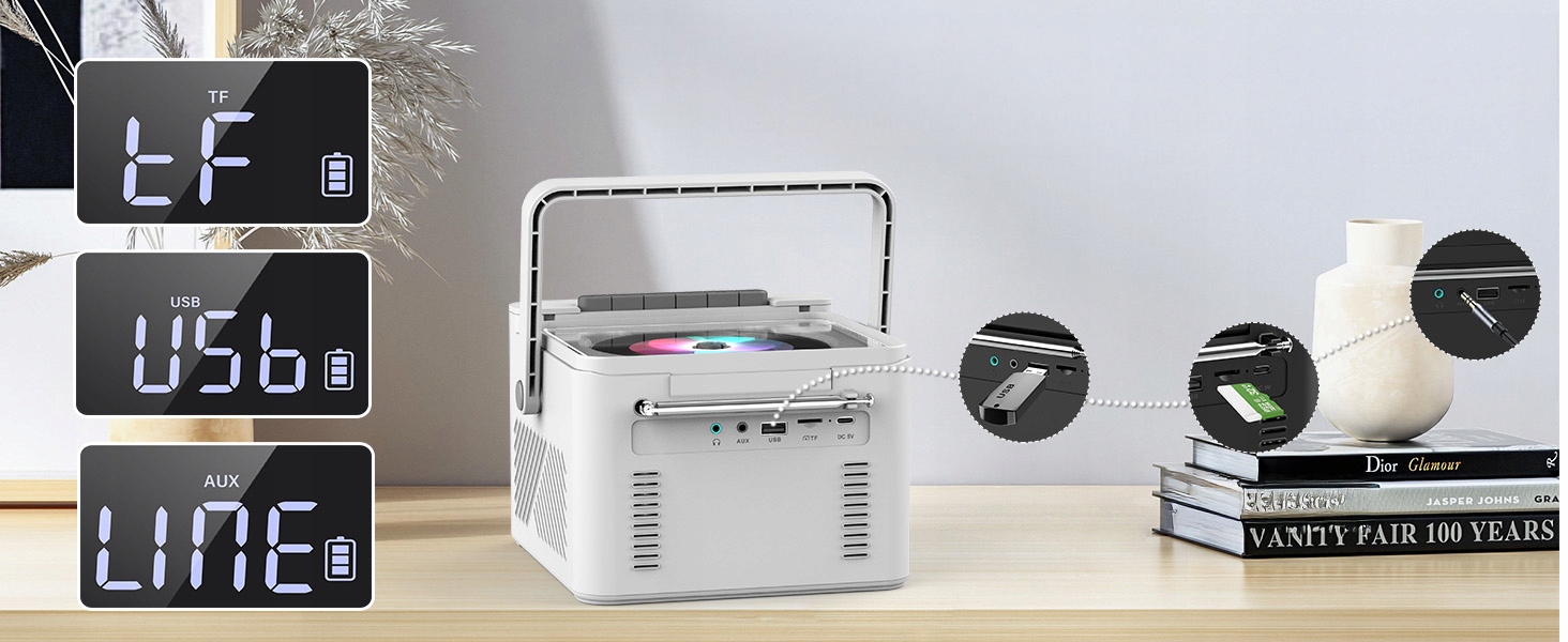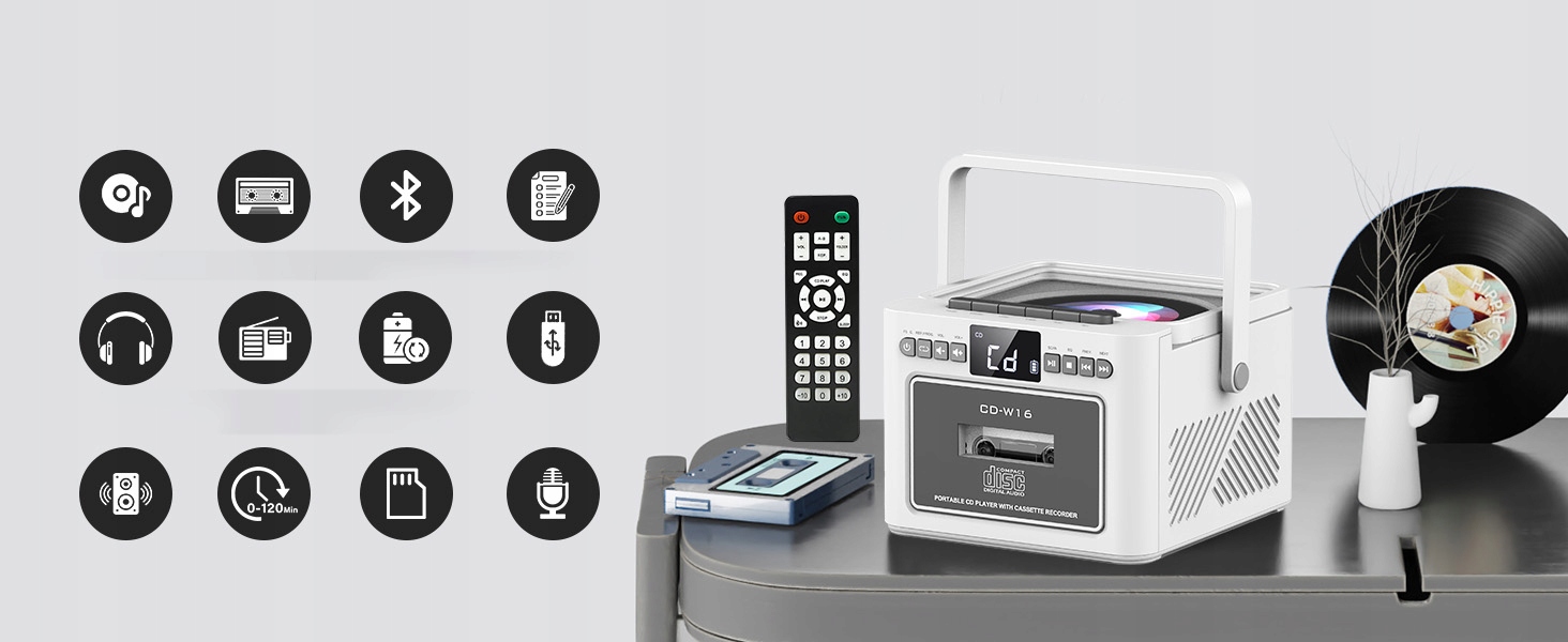 Програвач компакт-дисків пропонує різні варіанти відтворення, включаючи компакт-диски, радіо, касети, Bluetooth 5.1, USB, AUX і SD-карту. Цей касетний програвач має світлодіодний екран і пульт дистанційного керування для зручного керування. Легко перемикайтеся між піснями, регулюйте гучність і вибирайте різні режими відтворення. Завдяки цьому багатофункціональному пристрою ви можете насолоджуватися улюбленою музикою в різних режимах.