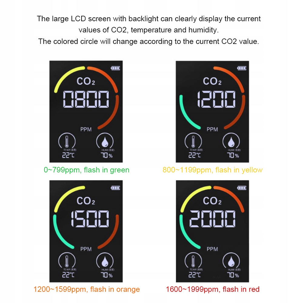 Великий РК-екран, різні кольори шрифтів відображають різну якість повітря, зелений 400-799ppm, жовтий 800-1199ppm, помаранчевий 1200-1599ppm, червоний 1600-199ppm, 2000ppm над чотирма кольорами одночасно Flash Flash . Вентиляційні отвори ззаду не тільки прискорюють конвекцію між повітрям і машиною для отримання ефективного виявлення, але й забезпечують ідеальний ефект розсіювання тепла. Ретельне виявлення вуглекислого газу, що використовується для обробітки парникових, сільськогосподарських виробництва, складу виробництва, лабораторії, сім'ї тощо.