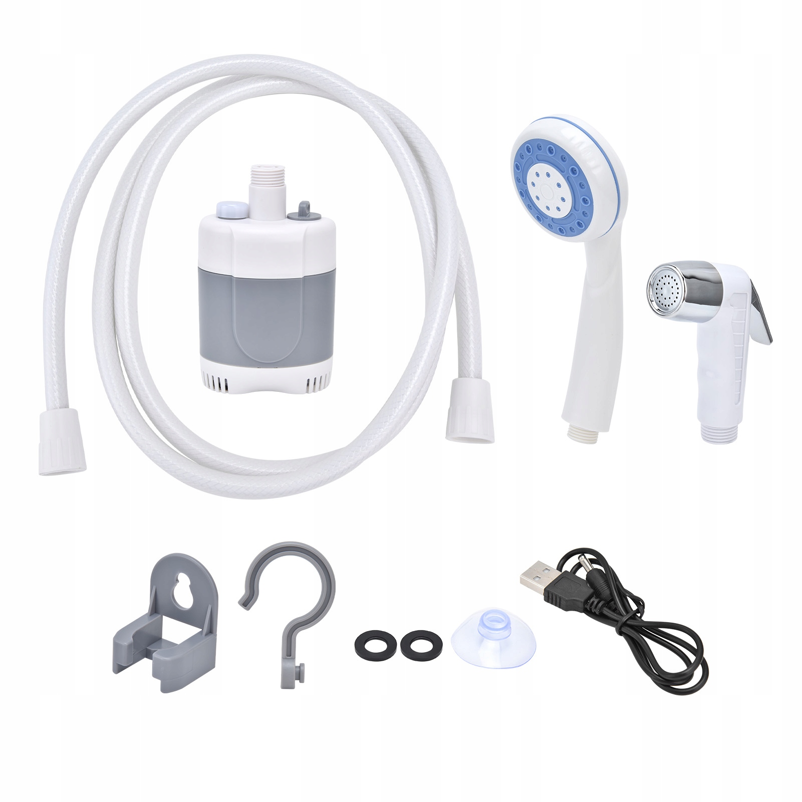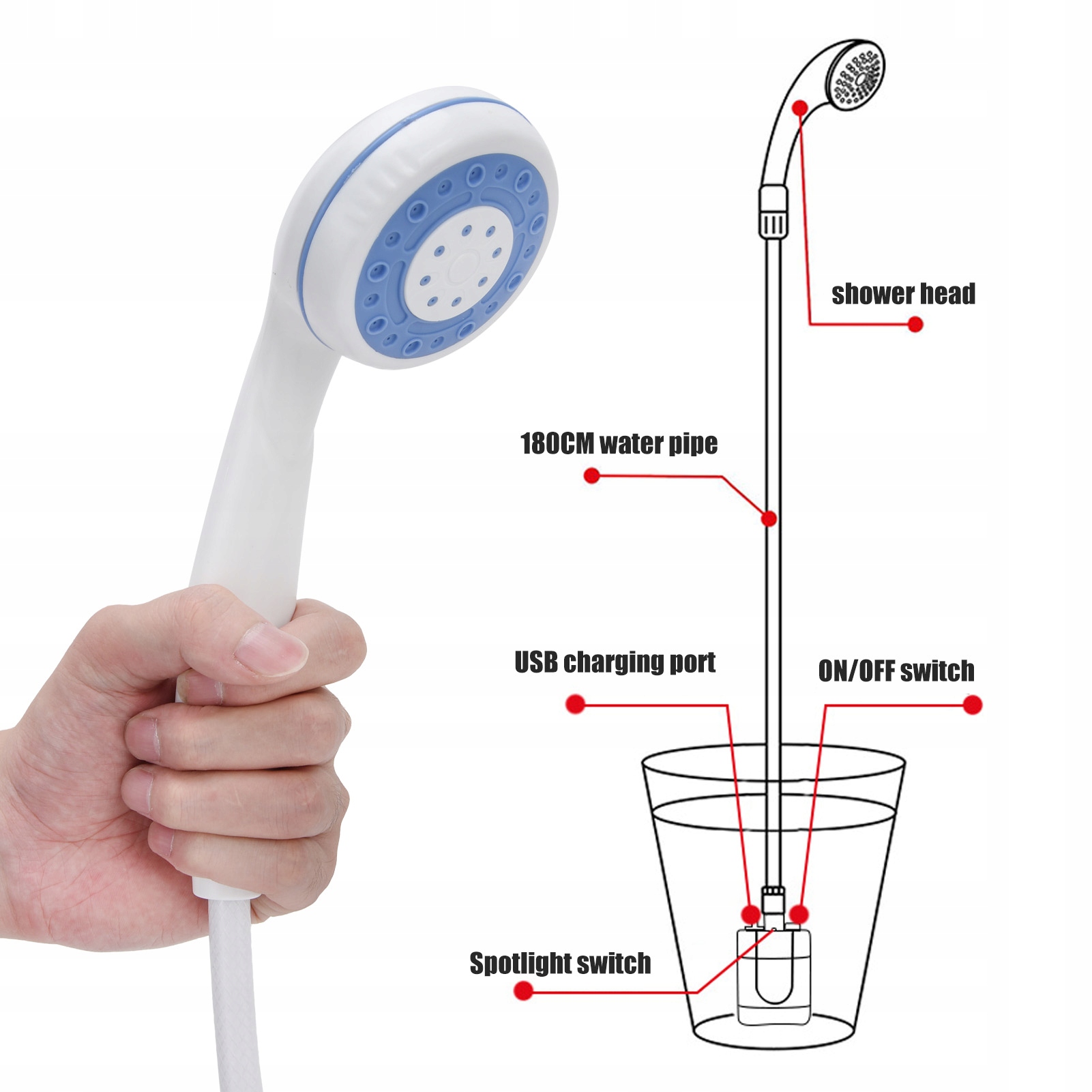 1. Вбудований 2200 мАг літієвий акумулятор, зарядка USB може бути заряджена джерелом живлення автомобіля або комп'ютером, зарядка 2-5 годин дозволяє 1 годину безперервного використання. Ідеальний і приємний тиск, душова головка має простий потік, зручну ванну, достатньо ніжного тиску води для людей похилого віку, немовлят та домашніх тварин. Він компактний, не займає місце і легко зберігати в багажі, рюкзаку або багажнику автомобіля, придатного для походів, кемпінгу, ванни для дітей та прибирання тварин. Невеликий розмір, невелика вага, простий у перенесенні, портативні, легко перенести під час подорожі, насолоджуйтесь усім комфортом будинку, вам не потрібні труби. Інтегрований водонепроникний перемикач, достатній для обробки короткого замочування та водостійкості у щоденному використанні. Світлодіодні ліхтарі полегшують душ вночі.